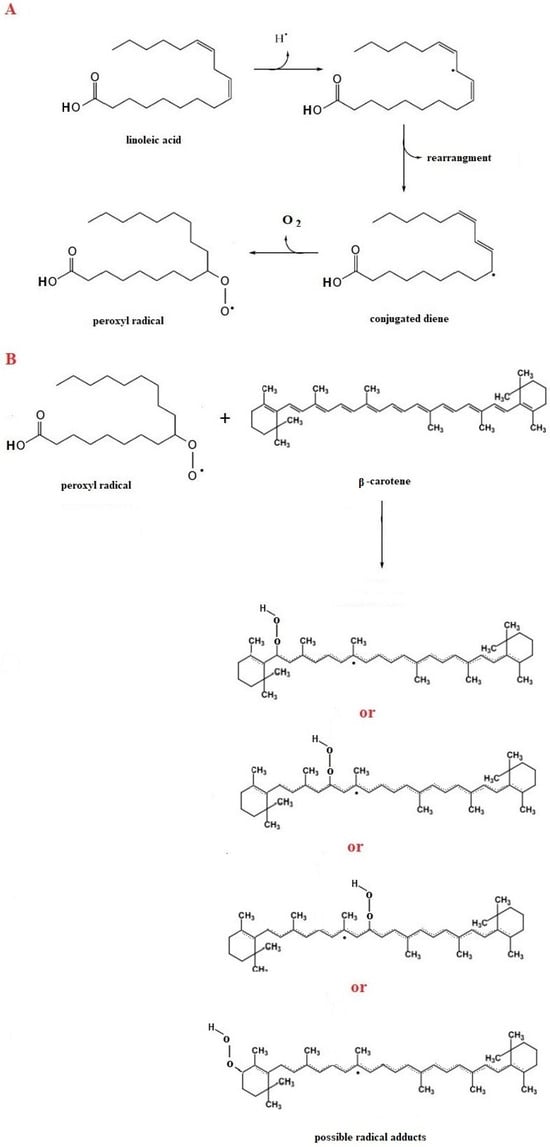 Reactions showing the oxidation of linoleic acid (A) and the possible formation of various radical adducts between β-carotene and a peroxyl radical (B) [,,,].