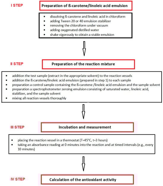 The β-carotene bleaching method was first proposed by Marco (1968) [] to prevent autoxidation of emulsified linoleic acid in extracts. Over time, the technique has undergone several modifications aimed at facilitating its application (simplified the operation) [] or converting it to microplates form []. Regardless of the modification, the β-carotene bleaching method is carried out in several stages, which are presented in Scheme 1 []. The most important step is the preparation of the test reagent See Step I in the scheme). For this purpose, a chloroform solution of β-carotene is prepared; the chloroform is evaporated under reduced pressure in the presence of linoleic acid and Tween (an emulsion stabilizer). During this time, the water is saturated with oxygen (usually 100 mL of water is saturated with oxygen for 30 min at a controlled flow of 100 mL/min), because the presence of oxygen and the elevated measurement temperature favor the oxidation of linoleic acid and the production of peroxide radicals. The resulting radical can either bleach the β-carotene or abstract a proton from the radical scavenger (antioxidant) []. Finally, the residue left after evaporation of the chloroform is gently combined with oxygenated water.