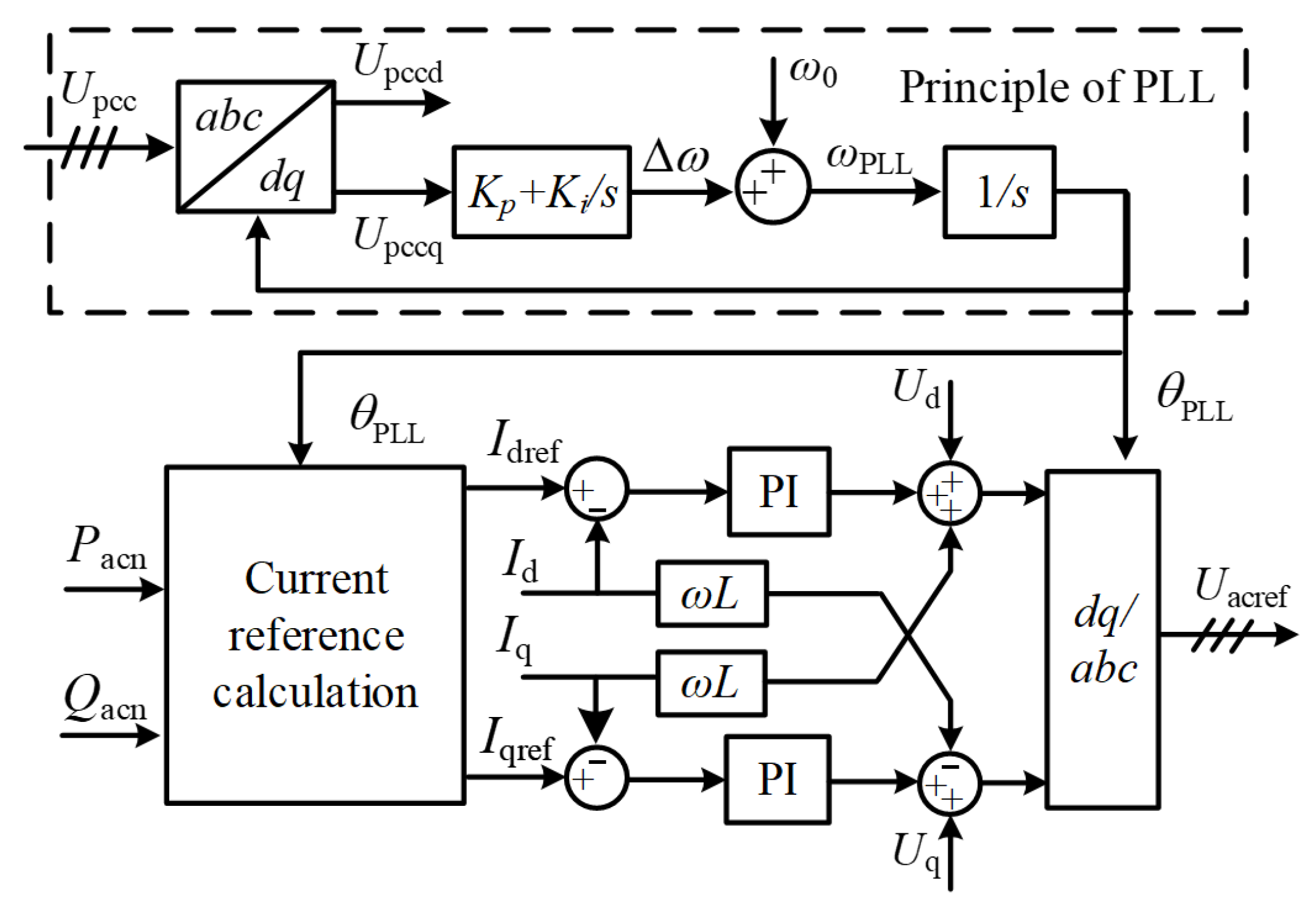 - Principle of the PLL: When a grid-side fault occurs, the current amplitude of the GFL DER could be directly limited. Therefore, the transient process of a GFL DER is mainly determined by the phase θPLL locked by the PLL, since θPLL is used for abc/dq coordinate transformation. As shown in Figure 3, first, the PCC voltage uPCC is transmitted to the PLL module through the sampling stage. The obtained Q-axis voltage component Uq generates an angular frequency offset Δω through the PI controller. The internal angular frequency ωPLL will pass through an integration unit to generate the internal phase angle θPLL. By designing the controller parameters of the current inner loop, it is ensured that the current inner loop can achieve rapid tracking of the reference current, and its control bandwidth is much greater than that of the PLL. According to Figure 3, the mathematical equation of PLL can be expressed as follows:where ω0, Kp, Ki, and Upccq represent the rated angular frequency, PI parameters, and the Q-axis component of uPCC, respectively.