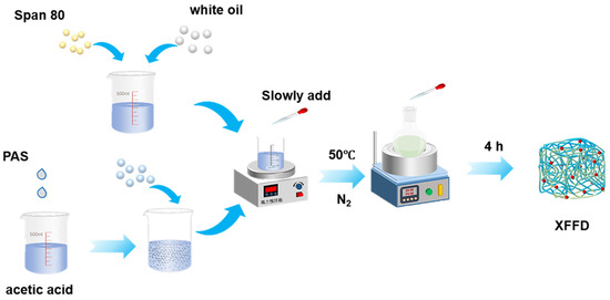 This experiment synthesized the target gel via inverse emulsion polymerization (Figure 1). The specific procedure began with the addition of 60 g of distilled water and 0.6 g of acetic acid into a beaker to form a 1% acetic acid solution under continuous magnetic stirring. Subsequently, 0.035% modified nano-silica (PAS) was added to the solution and subjected to ultrasonic dispersion to ensure homogeneous distribution, resulting in a stable suspension. Next, reaction monomers—acrylamide (AM), acrylic acid (AA), and p-nitroblue tetrazolium (PNBT)—were sequentially added to the suspension in a molar ratio of 7:2:1, followed by continued stirring until complete dissolution to obtain a homogeneous aqueous monomer solution. Meanwhile, 2.2% white oil and the emulsifier Span 80 were added into a separate three-neck flask to form a uniform oil phase under magnetic stirring. The prepared aqueous monomer solution was then slowly added dropwise into the oil phase under continuous stirring. After complete addition, the pH of the emulsion system was adjusted to neutral (pH = 7). The mixture was transferred to a water bath and heated to the specific reaction temperature. Under nitrogen (N2) purging, the system was stirred for 20 min to remove oxygen. Finally, a solution containing 0.35% crosslinker (TEMED) and initiator (NIBA) was slowly added dropwise into the system. The polymerization was allowed to proceed for 4 h under N2 atmosphere with constant stirring at 50 °C, ensuring complete reaction. The final product was the desired emulsion-type self-healing plugging gel, XFFD. (All percentages indicated are relative to the total solution mass or volume, as appropriate).