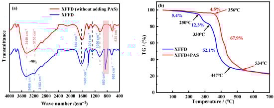 The infrared spectra of the PAS-free samples and XFFD (synthesized sample) are shown in Figure 2a. Its infrared spectrum (Figure 2a) shows the following characteristic absorption bands: 3440 cm−1 (N-H stretching vibration), 1620 cm−1 (C=O vibration), 1410 cm−1 (C-N stretching vibration), 1300 and 1055 cm−1 (C-O stretching vibration), and 654 cm−1 (O-H out-of-plane bending vibration) [25,26]. Compared with the control group without PAS, XFFD showed new absorption peaks at 862 cm−1 (C-H vibration) and 1410 cm−1 (silicon hydroxyl), which proved that PAS had successfully participated in the reaction and formed the target polymer. Interestingly, for XFFD without PAS, the two expected sharp, medium-intensity absorption peaks near ~3500 cm−1 and ~3400 cm−1 (assigned to non-hydrogen-bonded -NH2 groups) instead shifted to lower wavenumbers at 3440 cm−1 and 3156 cm−1, exhibiting a redshift phenomenon (Figure 2a). This shift is attributed to changes in the vibrational energy levels of the N-H bonds induced by hydrogen bonding, indicating the presence of multiple hydrogen bonding environments with varying strengths. Furthermore, after the incorporation of PAS, the characteristic peaks of -NH2 and O-H in XFFD shifted from 3440 cm−1 and 635 cm−1 to 3456 cm−1 and 665 cm−1, respectively, demonstrating a blueshift. This suggests that the strength of intermolecular hydrogen bonds within XFFD chains is somewhat reduced upon PAS addition, which likely results from a dynamic equilibrium between the formation and disruption of crosslinks among different polymer chains.