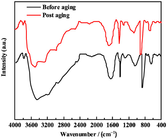 The Al2O3 crucible was first placed in the sample chamber and tared. Then, 0.4 g of the sample was weighed into the crucible, which was subsequently returned to the sample chamber. The TGA program was selected, and the temperature was raised to 700 °C at a heating rate of 10 K·min−1 under a nitrogen purge atmosphere to record the thermogravimetric (TG) curve. The thermal stability of both PCAA and PCAA without PAS was evaluated. By comparing the thermal decomposition curves of the two products, the effectiveness of PAS incorporation in enhancing the temperature resistance of PCAA was assessed. The residual mass percentage at the end of the measurement (700 °C) was found to be 22.3%. It can be seen from Figure 2b that the weight loss of XFFD without PAS is 5.4% between the normal temperature and 250 °C, which is caused by the evaporation of the free water attached to the sample. In the range of 250–330 °C, the weight loss of the sample is 12.3%, which is because the microstructure of the sample loosens with a further increase in heating temperature, and even the branch chain in the structure begins to decompose, resulting in the gradual collapse of the three-dimensional network structure. In the range of 330–447 °C, a 52.1% weight loss of the product was observed, which was due to the molecular chain breaking and decomposition at a high temperature. After 447 °C, the product was thermally degraded until complete. In conclusion, XFFD without PAS began to decompose at 270 °C, while XFFD with functional monomer PAS began to decompose after 330 °C, indicating that PAS is helpful to improve the thermal stability of XFFD. The TGA result confirms the chemical (covalent) stability of the polymer chains up to 356 °C, meaning no chain scission occurs at 150 °C. The swelling behavior is governed by the physical crosslinks (hydrogen bonds, hydrophobic interactions). At elevated temperatures, the kinetic energy increases, leading to a partial, reversible dissociation of these dynamic physical bonds. This is a well-known phenomenon in associative polymer networks. This temporary “loosening” of the network allows more water molecules to penetrate, thus increasing the equilibrium swelling ratio. Crucially, upon cooling, these bonds can readily re-form, restoring the gel’s mechanical properties. This reversible behavior is a hallmark of a robust dynamic network and is entirely consistent with excellent thermal stability, not contrary to it. We have added the FTIR spectra of the XFFD gel after aging at 150 °C for 16 h (Figure 4). The spectrum is virtually identical to that of the fresh gel, with no appearance of new degradation peaks (e.g., from oxidation) or disappearance of key functional groups. This provides direct evidence that no significant chemical degradation occurred.