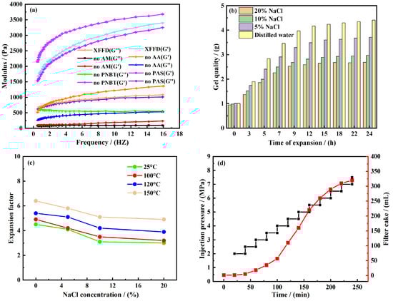 Viscoelastic variation. The viscoelastic variation curve of the self-healing sealing gel is shown in Figure 5a. The rheological measurements were conducted in triplicate, and the data shown represent the mean values, demonstrating good reproducibility with a standard deviation of less than 5%. We now explicitly state the physical significance of the storage modulus (G′) and loss modulus (G″) in the context of our material. Specifically, we explain that G′ > G″ across the measured frequency range indicates the dominant elastic, solid-like behavior of the gel network, which is crucial for its long-term sealing capability and structural stability. According to Figure 5a, the elastic modulus (G′) of all gel samples is greater than the viscosity modulus (G″), which proves that they are essentially elastic materials. The monomer deletion test showed that the G′ and G″ values of the gel without AA, PAS, or AM were lower than those of XFFD, which proved that these three monomers could enhance the viscoelasticity of the gel and promote the formation of a three-dimensional network structure, and the enhancement efficiency followed the order of am > AA > pas. Specifically, by extending the polymer chain and providing dynamic functional groups, am can enhance the network and endow it with a self-repairing ability. AA is electrostatically crosslinked through carboxyl groups to consolidate the network. The hydrophobic long chain of PAS has a weak effect on strength improvement. On the contrary, the gel without PNBT showed a slight increase in G′ and a slight decrease in G″, indicating that PNBT mainly contributed to the viscosity response of the system. As a multi-side chain macromolecule formed by the grafting core, PNBT can enhance the intermolecular interaction through dense hydrogen bonds [27,28].