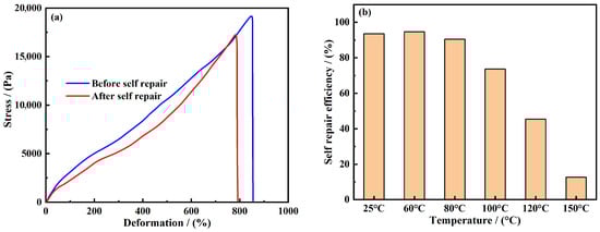 Uniaxial tensile test was used to test the tensile fracture of the samples of the gel before and after repair on the universal tensile testing machine, so as to obtain the stress–strain relationship and evaluate the self-repair efficiency of the gel [24] (the ratio between the tensile stress of the gel after repair and the tensile stress of the original gel).