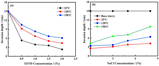 By analyzing the data in Figure 7a, it can be seen that, under room temperature, the invasion depth of drilling fluid in the sand bed increases from 0.5% to 2% with the concentration of XFFD and significantly decreases from 3.6 cm to 1.0 cm, indicating that XFFD has an excellent plugging performance. After aging at 120 °C and 150 °C for 16 h, the invasion depth of the drilling fluid containing 2% XFFD was only 4.0 cm and 4.2 cm, respectively, while the base mud had been completely lost (15 cm), which further proved its excellent plugging performance at a high temperature.