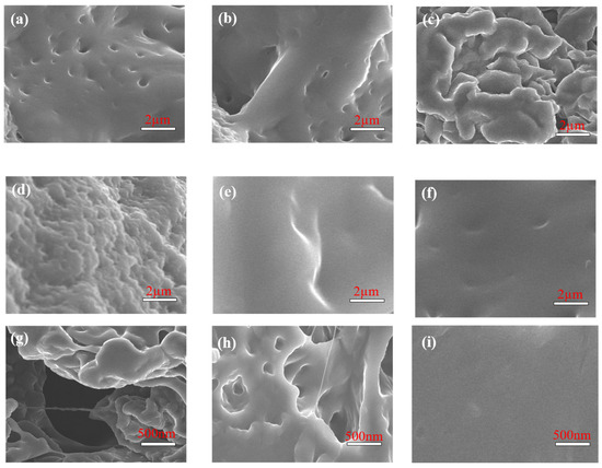The mud cake surface (Figure 8a) of the non-aged base slurry presents a uniform and dense structure. After high temperature treatment at 120 °C (Figure 8b) and 150 °C (Figure 8c), the mud cake surface shows significant deterioration, showing the formation of a large number of holes and cracks. This structural failure is mainly due to the aggregation effect of clay particles induced by high temperature, which leads to the loosening of the mud cake skeleton, and then causes the rapid increase in drilling fluid filtration. The mud cake containing 2% XFFD shows excellent compactness at 25 °C (Figure 8d), and there are no visible pores or cracks on the surface. This is due to the adsorption of XFFD molecules on the surface of clay particles, which promotes the polymer gel microspheres to achieve close packing through intermolecular forces, forming a dynamic sealing layer with self-healing characteristics. Under the aging condition of 120 °C (Figure 8e), the gel microspheres maintain the integrity of the plugging layer through the dynamic reorganization of the molecular chain and significantly enhance the plugging ability of the mud cake for pores and fractures. When the temperature rises to 150 °C (Figure 8f), although the bulk density of gel microspheres decreases locally, and a few microspheres have small defects on the surface, the mud cake as a whole still maintains a continuous and compact structure without penetrating pores, showing excellent high-temperature plugging resistance. The above microstructure evolution rules show that the XFFD plugging agent can effectively maintain the compactness of the mud cake in a high-temperature environment by constructing a dynamic and stable polymer network structure. The self-healing mechanism can realize the dynamic repair of defective parts through the thermal movement of molecular chains, which provides an important material support for wellbore stability in deep formation drilling. This unique temperature-responsive plugging property gives XFFD significant application advantages in a high-temperature drilling fluid system. High-resolution images showing the “pores,” “cracks,” and “self-healing” are presented in Figure 8g–i.