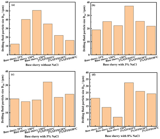 As shown in Figure 10a, at 25 °C, the particle size distribution curve of the drilling fluid containing 2% XFFD shifted significantly to the right compared with the base mud, indicating that XFFD formed a compatibilization effect on the surface of clay particles through adsorption, resulting in the increase in the average particle size of the system.