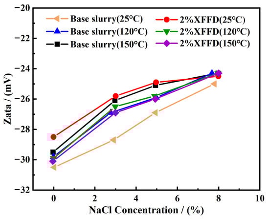 Zeta potential analysis. As shown in Figure 11, The zeta potential of the base slurry increased with the increase in temperature. At the same time, the zeta potential also increases with the increase in the NaCl concentration, which is attributed to the compression of the diffusion double layer on the surface of clay particles by Na+. In addition, the zeta potential of XFFD-containing drilling fluid is generally slightly higher than that of base mud at room temperature, regardless of whether the system contains salt or not. After aging at 120 °C and 150 °C, the addition of XFFD maintained the relative potential difference through adsorption, which reduced the zeta potential of the drilling fluid and promoted the dispersion of clay. A further decrease in the potential after high-temperature aging can be attributed to the weakening of the interaction between PCAA and clay. The above results confirm that the XFFD plugging agent can significantly inhibit the aggregation tendency of clay particles under high-temperature and high-salinity conditions by maintaining the charge stability of the system, thus providing effective support for the control of the rheological properties of drilling fluid in deep complex formations. As the temperature increases, the surface charge density of XFFD decreases, leading to a reduction in the absolute value of the zeta potential. This weakens the electrostatic double-layer repulsive forces, allowing van der Waals attractive forces to dominate. Consequently, the particles rapidly form a gel, achieving effective plugging. With increasing NaCl concentration, the double layer is significantly compressed, causing repulsive forces to nearly vanish. Under these conditions, the particles rapidly aggregate into a “dense fractal structure,” forming a self-healing gel via the “strong attraction” regime described in Derjaguin–Landau–Verwey–Overbeek (DLVO) theory, thereby effectively sealing the fractures. As the aging temperature increased, the zeta potential of XFFD-containing drilling fluid decreased, likely due to the reduced interaction between XFFD and clay particles under elevated temperatures.