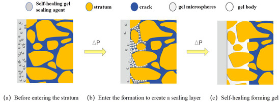 Conventional gel packers often exhibit weak particle interactions and suboptimal sealing performance. The developed packer in this study incorporates self-healing properties to enhance containment efficiency. Through reverse emulsion polymerization, we synthesized the XFFD packer where gel microspheres are suspended within a dispersed phase. When injected into formation fractures and pores via drilling fluid, these microspheres undergo migration, aggregation, filling, and compression under pressure. The self-healing process forms a cohesive gel matrix that interacts with fracture walls through adsorption, creating a robust sealing layer. This self-repairing structure maintains the integrity of a unified gel system, demonstrating high compressive strength and retention capacity. The schematic diagram illustrating the sealing mechanism is shown in Figure 12.
