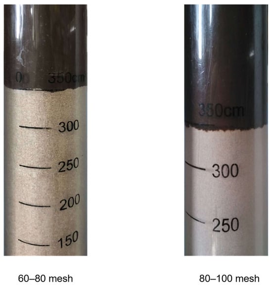 Plugging performance evaluation. In order to evaluate the plugging performance of the self-repairing plugging agent XFFD, sulfonated asphalt and calcium carbonate commonly used in the field were selected as the contrast materials, which were, respectively, added into the drilling fluid system at a dosage of 2%, and the plugging experiment of 40–60 mesh sand bed was carried out. The results of the invasion depth of each system in the sand bed under different temperature conditions (room temperature, 120 °C, and 150 °C aging) and the environment containing 10% NaCl are summarized in Table 2. The results show that the increase in aging temperature and salt content will cause the sand bed invasion of different drilling fluid systems, but the increase in invasion depth of the XFFD system is the most limited, which is always controlled within 5 cm. Especially under the conditions of a high temperature and 10% NaCl, the invasion depth of drilling fluid containing 2% XFFD is significantly lower than that of the sulfonated asphalt and calcium carbonate system, indicating that its plugging performance is the best. Further, the drilling fluid containing 2% XFFD was aged at 150 °C for 16 h, and the plugging experiments were carried out in 60–80 mesh and 80–100 mesh sand beds, respectively (Figure 13). The results showed that the invasion depth was very low, close to zero, which fully showed that the self-healing plugging drilling fluid had an excellent adaptive plugging ability and high-temperature stability.
