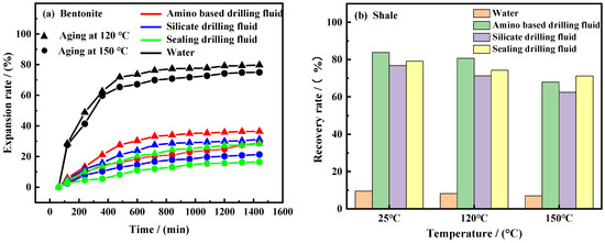 Hydration expansion rate of bentonite in different drilling fluids. (a) After aging at 120 °C and 150 °C, (b).