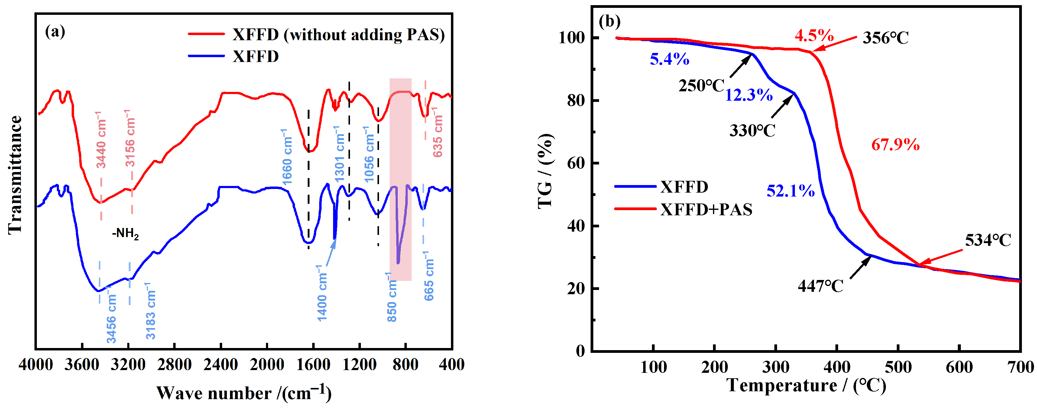 −1 (silicon hydroxyl), which proved that PAS had successfully participated in the reaction and formed the target polymer. Interestingly, for XFFD without PAS, the two expected sharp, medium-intensity absorption peaks near ~3500 cm