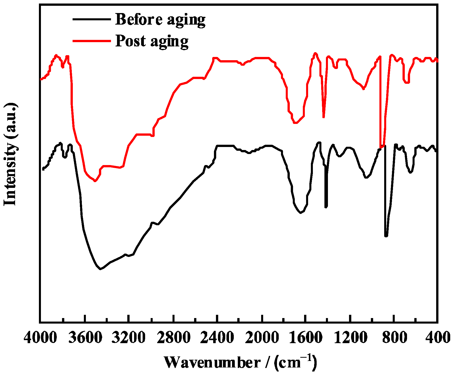Figure 2b that the weight loss of XFFD without PAS is 5.4% between the normal temperature and 250 °C, which is caused by the evaporation of the free water attached to the sample. In the range of 250–330 °C, the weight loss of the sample is 12.3%, which is because the microstructure of the sample loosens with a further increase in heating temperature, and even the branch chain in the structure begins to decompose, resulting in the gradual collapse of the three-dimensional network structure. In the range of 330–447 °C, a 52.1% weight loss of the product was observed, which was due to the molecular chain breaking and decomposition at a high temperature. After 447 °C, the product was thermally degraded until complete. In conclusion, XFFD without PAS began to decompose at 270 °C, while XFFD with functional monomer PAS began to decompose after 330 °C, indicating that PAS is helpful to improve the thermal stability of XFFD. The TGA result confirms the chemical (covalent) stability of the polymer chains up to 356 °C, meaning no chain scission occurs at 150 °C. The swelling behavior is governed by the physical crosslinks (hydrogen bonds, hydrophobic interactions). At elevated temperatures, the kinetic energy increases, leading to a partial, reversible dissociation of these dynamic physical bonds. This is a well-known phenomenon in associative polymer networks. This temporary “loosening” of the network allows more water molecules to penetrate, thus increasing the equilibrium swelling ratio. Crucially, upon cooling, these bonds can readily re-form, restoring the gel’s mechanical properties. This reversible behavior is a hallmark of a robust dynamic network and is entirely consistent with excellent thermal stability, not contrary to it. We have added the FTIR spectra of the XFFD gel after aging at 150 °C for 16 h (