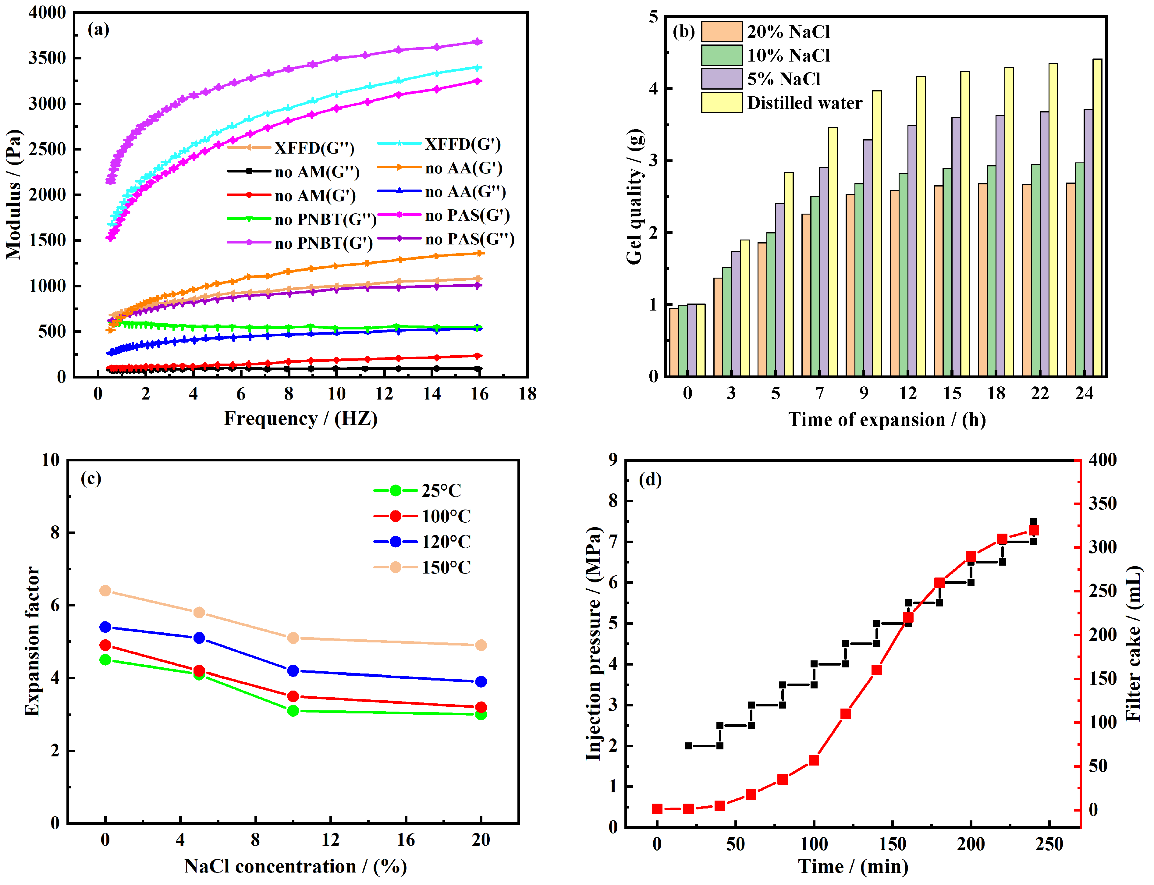 Figure 5a, the elastic modulus (G′) of all gel samples is greater than the viscosity modulus (G″), which proves that they are essentially elastic materials. The monomer deletion test showed that the G′ and G″ values of the gel without AA, PAS, or AM were lower than those of XFFD, which proved that these three monomers could enhance the viscoelasticity of the gel and promote the formation of a three-dimensional network structure, and the enhancement efficiency followed the order of am > AA > pas. Specifically, by extending the polymer chain and providing dynamic functional groups, am can enhance the network and endow it with a self-repairing ability. AA is electrostatically crosslinked through carboxyl groups to consolidate the network. The hydrophobic long chain of PAS has a weak effect on strength improvement. On the contrary, the gel without PNBT showed a slight increase in G′ and a slight decrease in G″, indicating that PNBT mainly contributed to the viscosity response of the system. As a multi-side chain macromolecule formed by the grafting core, PNBT can enhance the intermolecular interaction through dense hydrogen bonds [