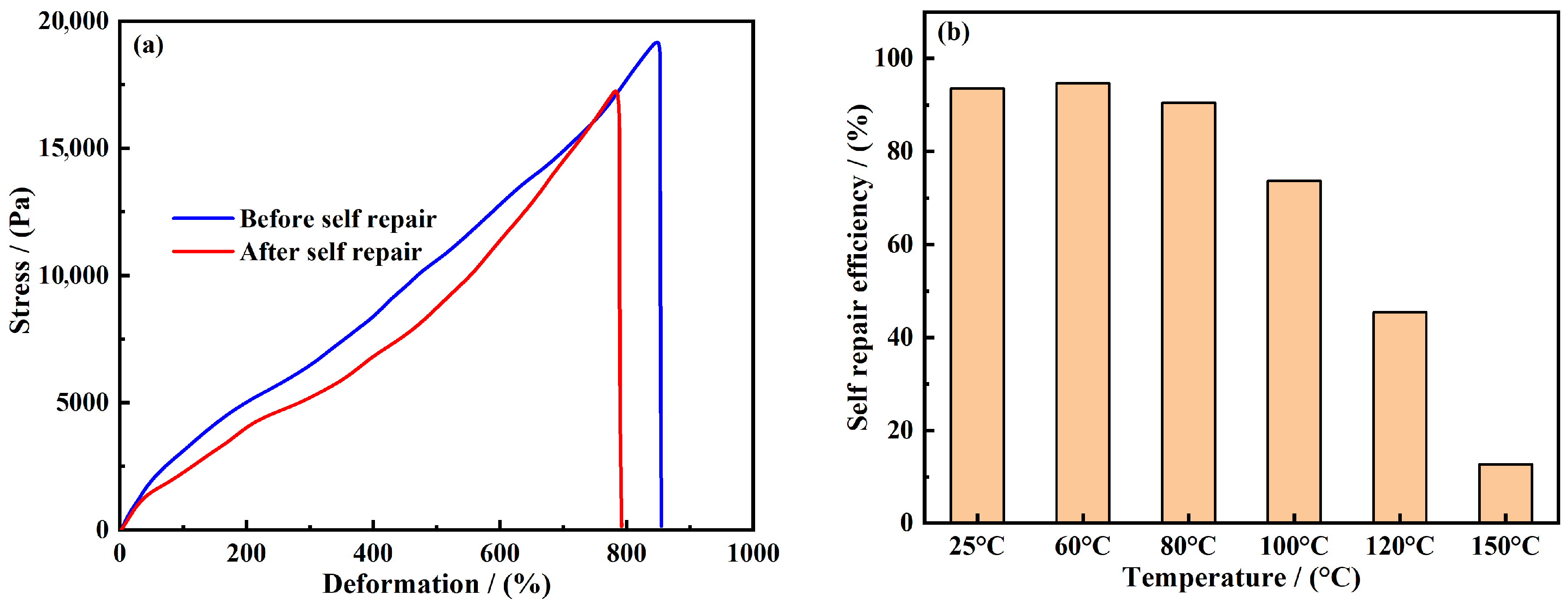 It can be seen from the figure that the gel sample shows typical elastic deformation characteristics under the action of stress increase, which shows a linear growth trend with the strain value. When the stress reaches the critical value (19.2 KPa), the sample breaks suddenly, and the corresponding maximum deformation is 855%, indicating that the original gel has excellent tensile toughness. After self-repair treatment, the maximum tensile stress of the sample is 17.5 KPa, and the fracture deformation is 792%. According to the calculation formula of self-repair efficiency (Formula (1)), the repair efficiency is 91.15%.