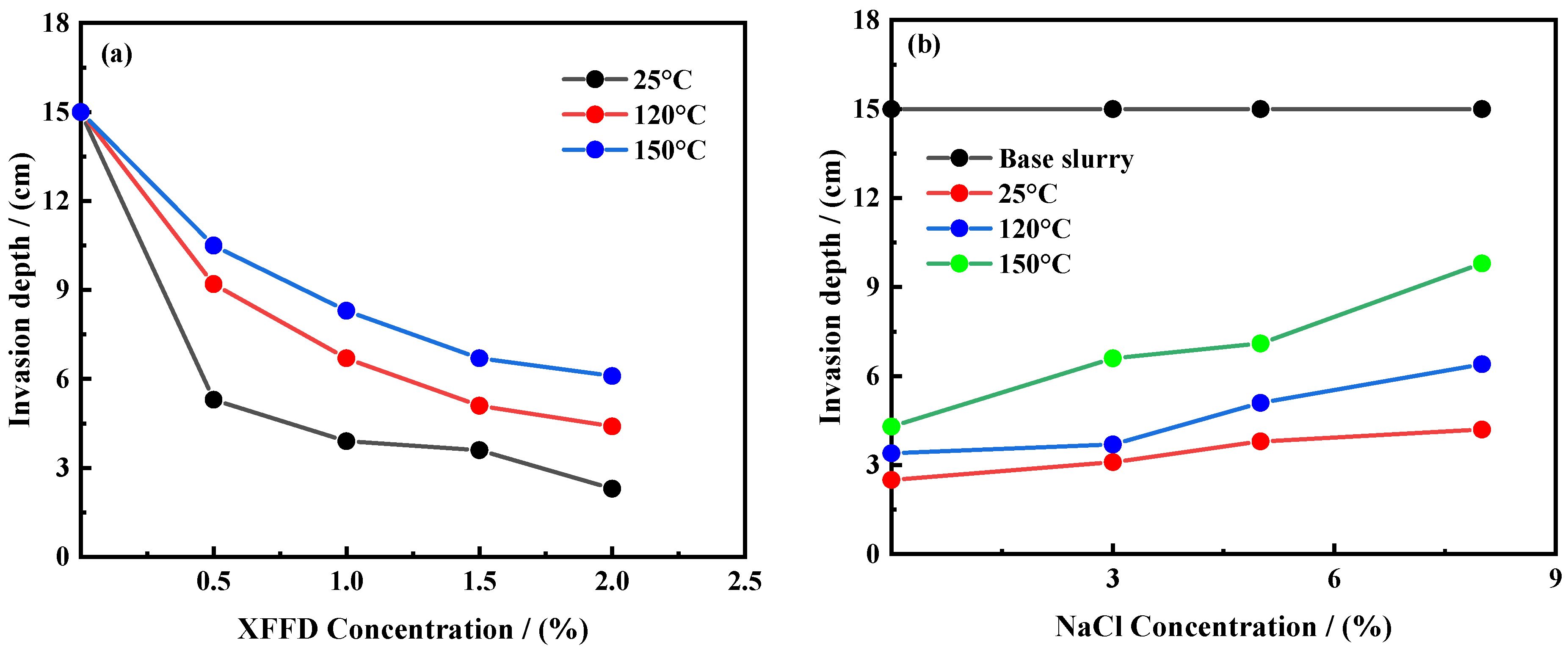 Figure 7a, it can be seen that, under room temperature, the invasion depth of drilling fluid in the sand bed increases from 0.5% to 2% with the concentration of XFFD and significantly decreases from 3.6 cm to 1.0 cm, indicating that XFFD has an excellent plugging performance. After aging at 120 °C and 150 °C for 16 h, the invasion depth of the drilling fluid containing 2% XFFD was only 4.0 cm and 4.2 cm, respectively, while the base mud had been completely lost (15 cm), which further proved its excellent plugging performance at a high temperature.