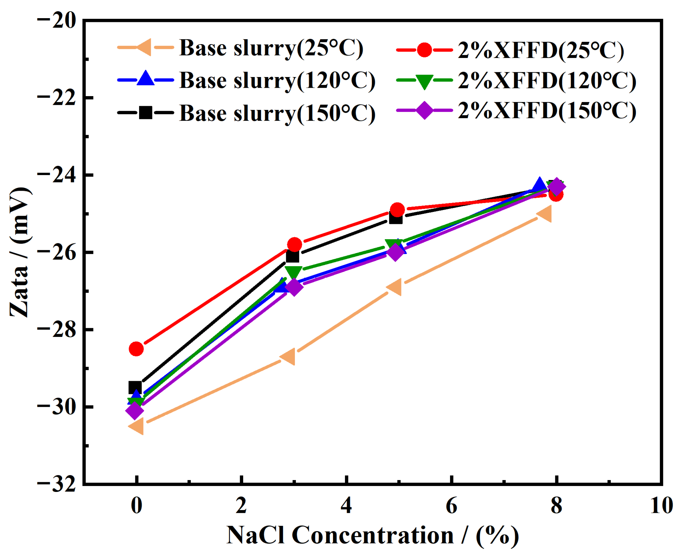 Figure 11, The zeta potential of the base slurry increased with the increase in temperature. At the same time, the zeta potential also increases with the increase in the NaCl concentration, which is attributed to the compression of the diffusion double layer on the surface of clay particles by Na