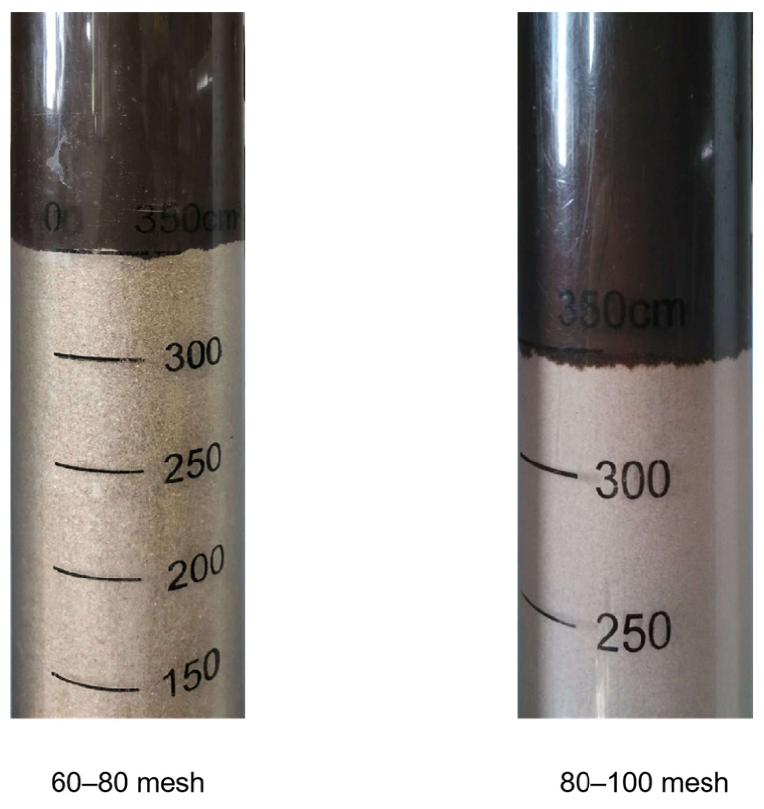 Table 2. The results show that the increase in aging temperature and salt content will cause the sand bed invasion of different drilling fluid systems, but the increase in invasion depth of the XFFD system is the most limited, which is always controlled within 5 cm. Especially under the conditions of a high temperature and 10% NaCl, the invasion depth of drilling fluid containing 2% XFFD is significantly lower than that of the sulfonated asphalt and calcium carbonate system, indicating that its plugging performance is the best. Further, the drilling fluid containing 2% XFFD was aged at 150 °C for 16 h, and the plugging experiments were carried out in 60–80 mesh and 80–100 mesh sand beds, respectively (
