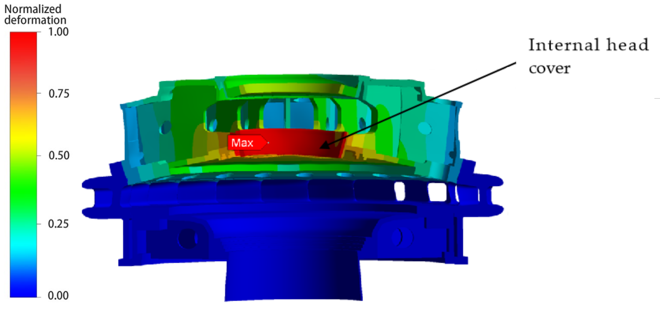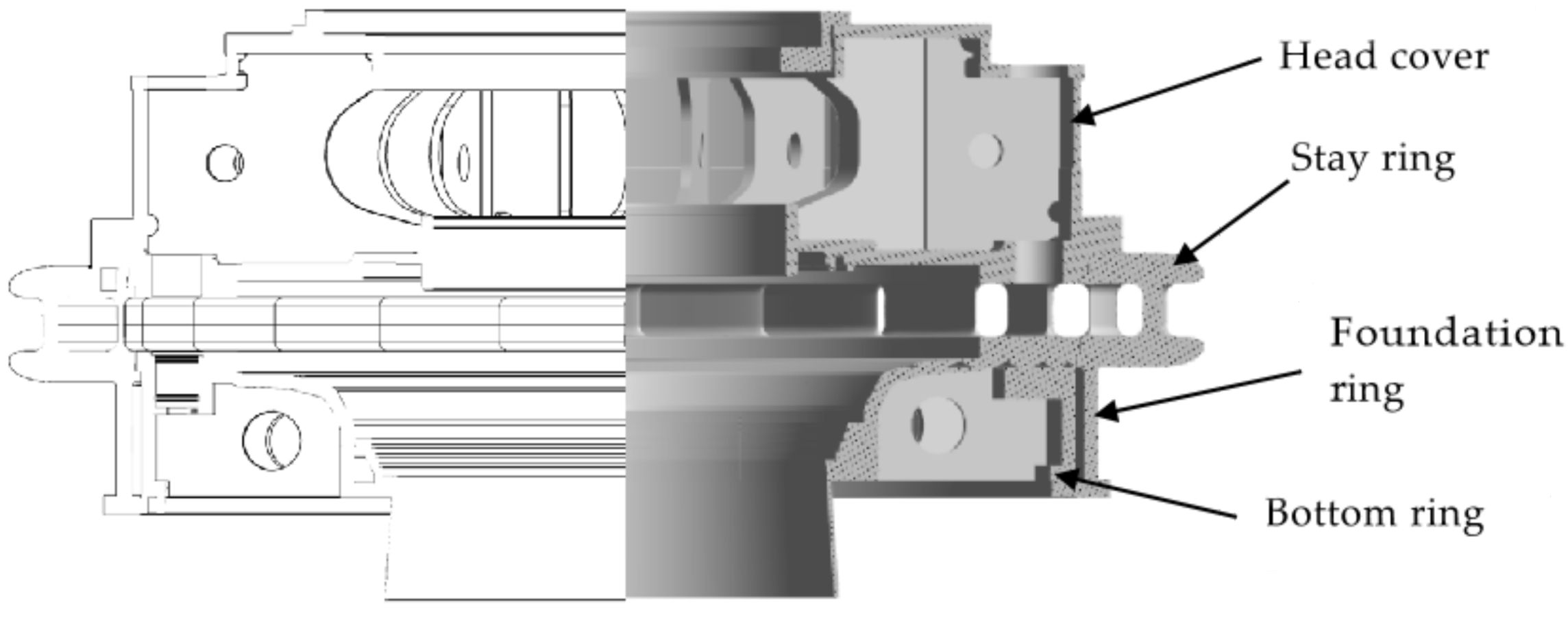 - The maximum stress values in the core components (head cover, stay ring) of structural Design A are lower than those in Structural Design B. Structural Design B features a more uniform internal stress distribution, resulting in higher load-bearing capacity and enhanced structural safety.