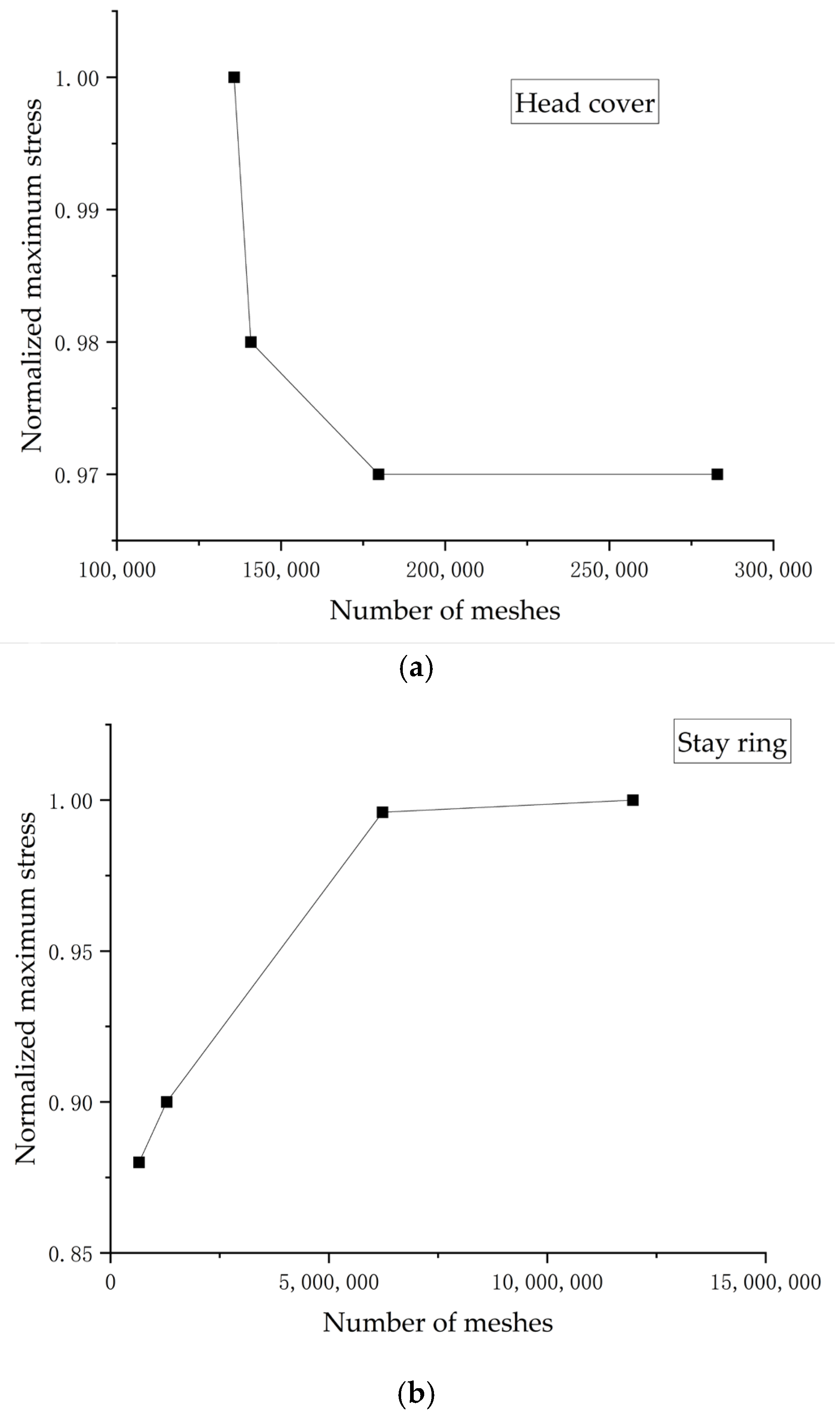 - Hong, Z.; Shihai, H.; Junpeng, Z.; Min, S.; Weibin, S.; Yanmei, M. Optimization Analysis of Head Cover Structure of High Head Pump Turbine. J. Phys. Conf. Ser. 2024, 2752, 012087. [Google Scholar] [CrossRef]