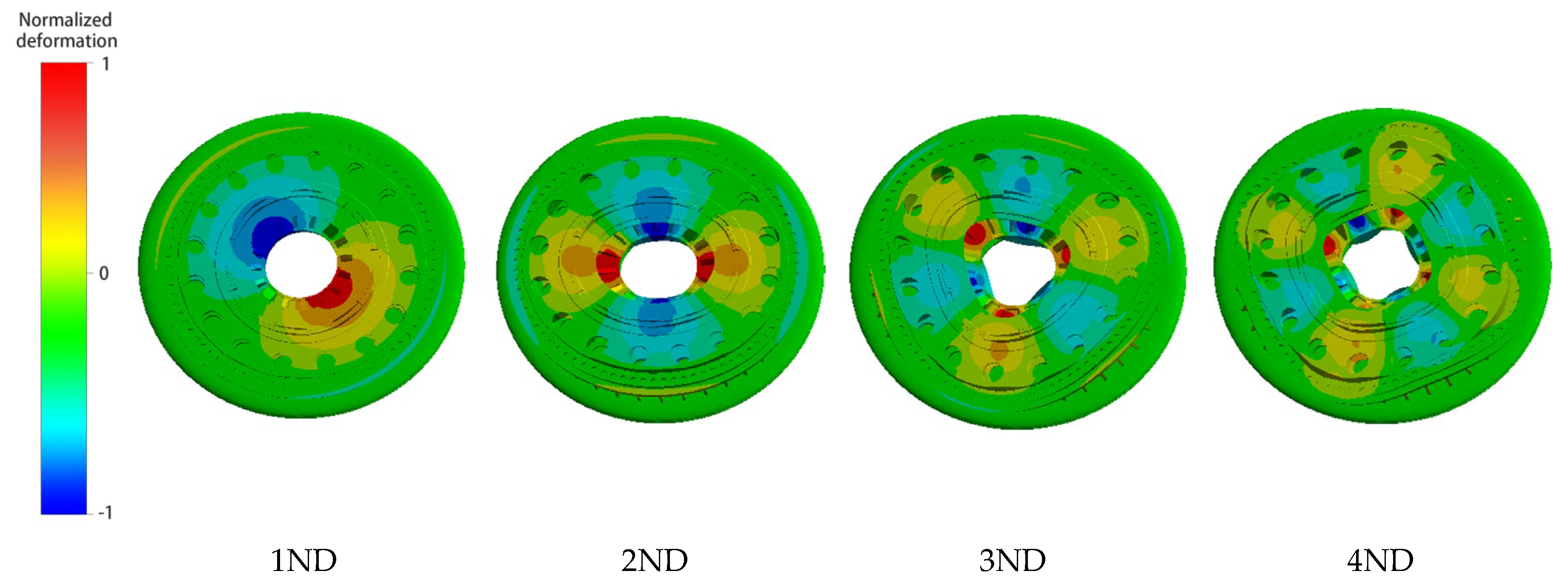 - Egusquiza, E.; Valero, C.; Liang, Q.; Coussirat, M.; Seidel, U. Fluid Added Mass Effect in the Modal Response of a Pump-Turbine Impeller. In Proceedings of the 22nd Biennial Conference on Mechanical Vibration and Noise, Parts A and B, ASMEDC, San Diego, CA, USA, 30 August–2 September 2009; Volume 1, pp. 715–724. [Google Scholar]