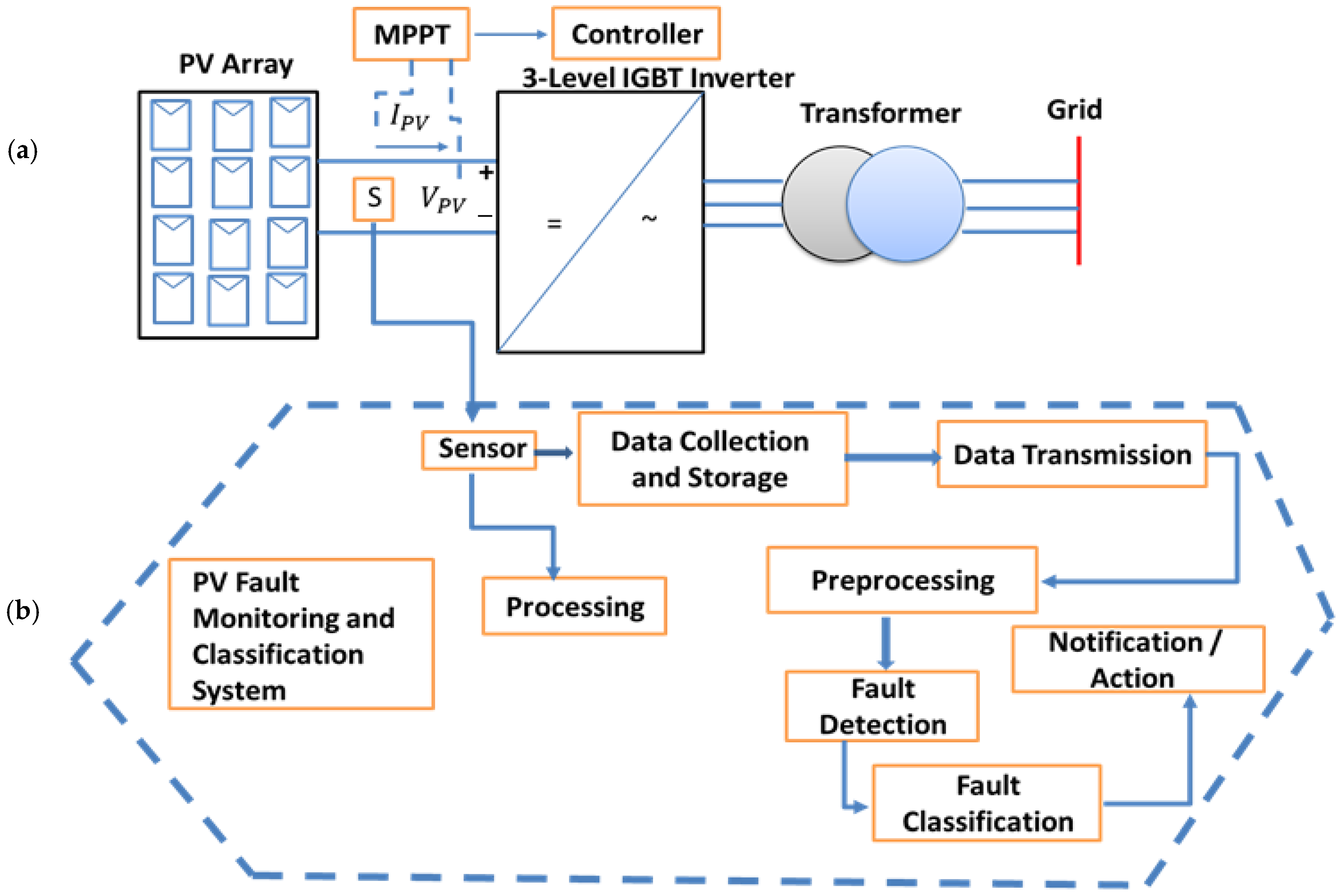 Figure 2 presents the overall architecture of the proposed PV fault monitoring and classification system. Sub-figure (a) illustrates the power conversion section, where the PV array is connected to the MPPT and controller that regulate the inverter and transformer before grid connection. Sub-figure (b) shows the data-driven fault detection framework, which includes data acquisition, preprocessing, fault detection, classification, and notification. Measured electrical and environmental parameters (current, voltage, power, irradiance, and temperature) are processed to identify abnormal operating conditions and trigger corrective actions when faults occur.