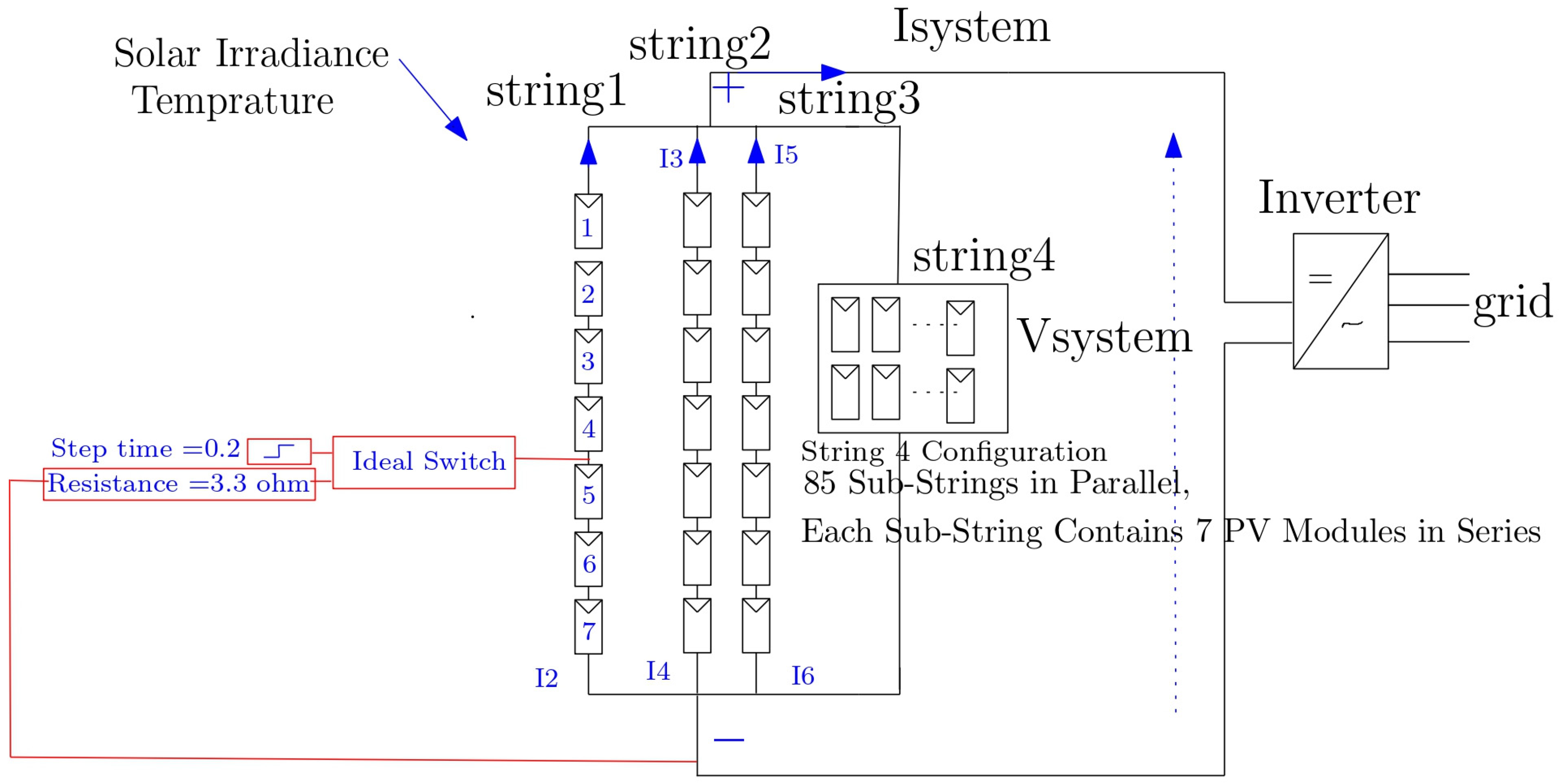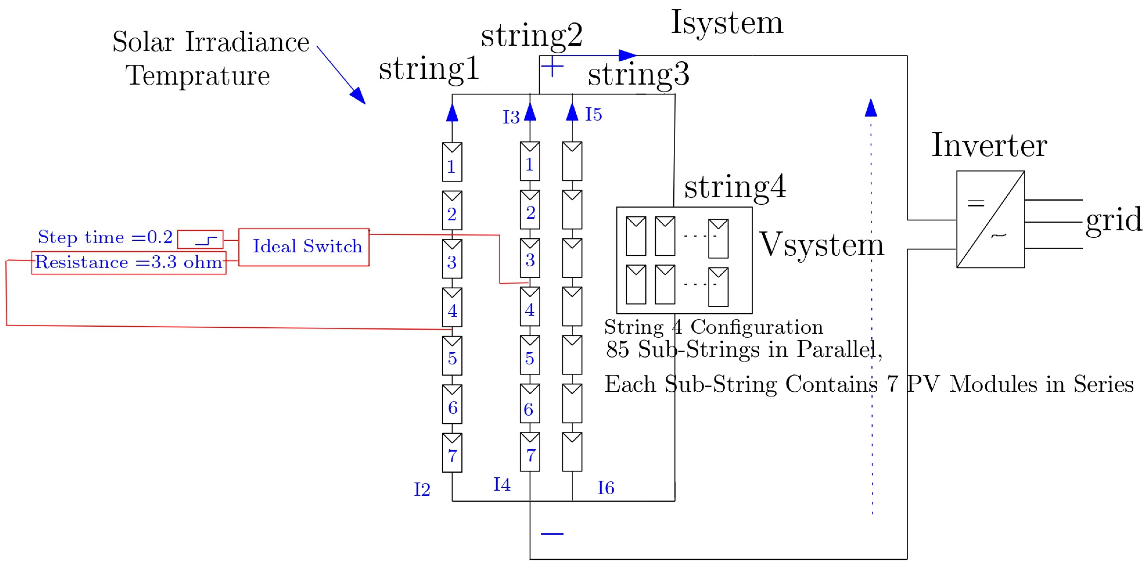 This fault is simulated by an insulation failure resulting in an unintentional connection between string 1 and string 2 as shown in