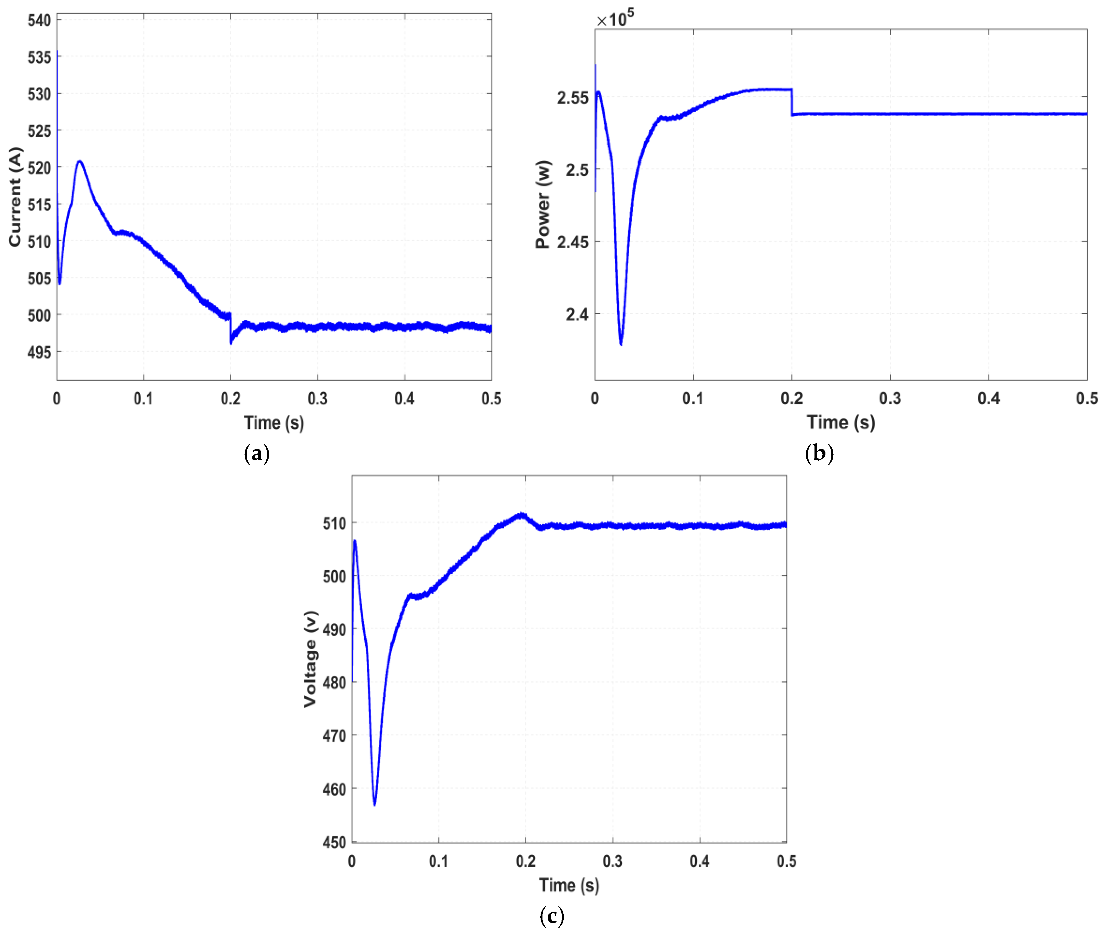 Figure 7. where sub-figure (a) illustrates the total current, (b) represents the total voltage, and (c) depicts the total power at the DC side.