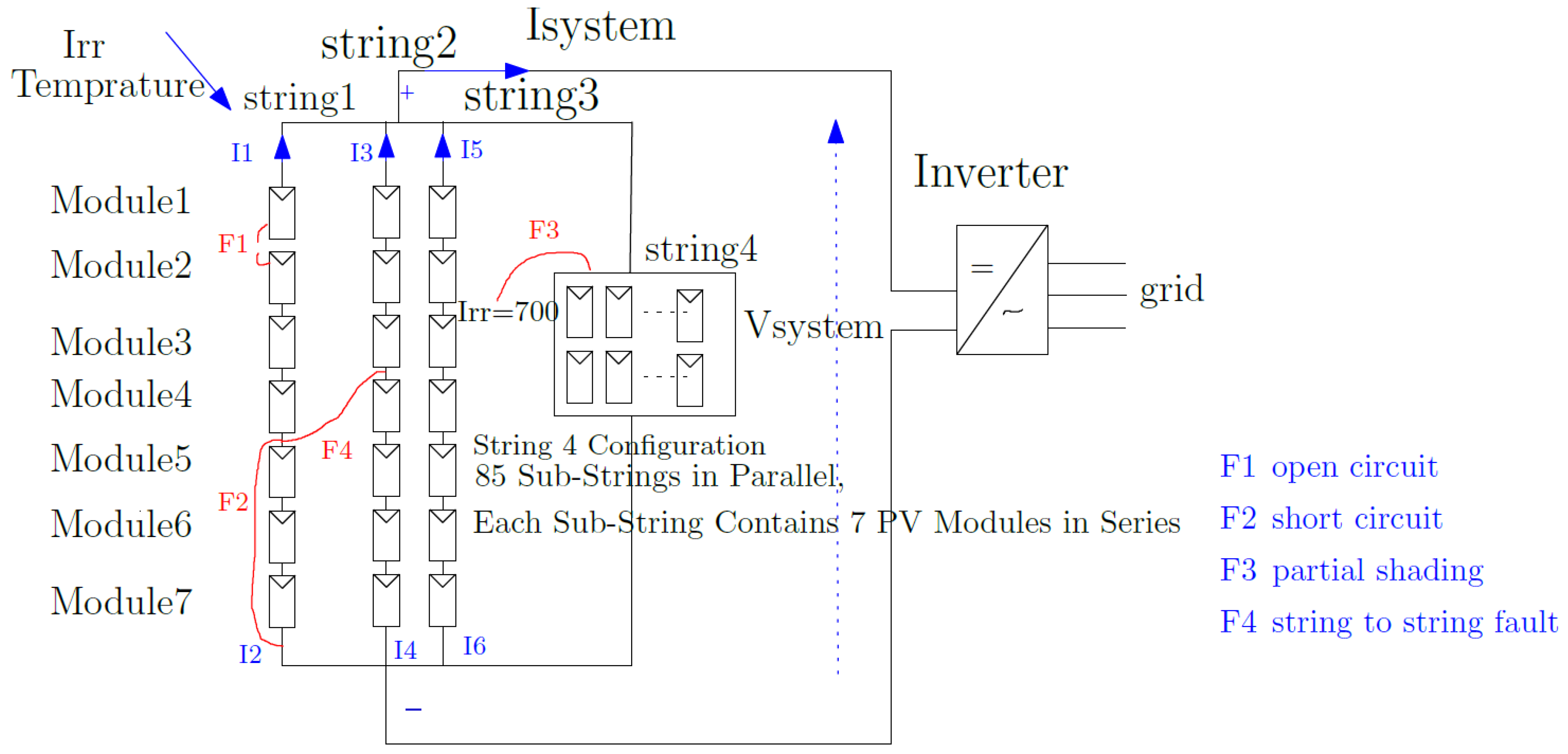 For each scenario, data were generated by applying variable irradiance and temperature profiles to emulate real-world conditions. Faults were injected at different string and module positions to ensure data diversity and robustness.