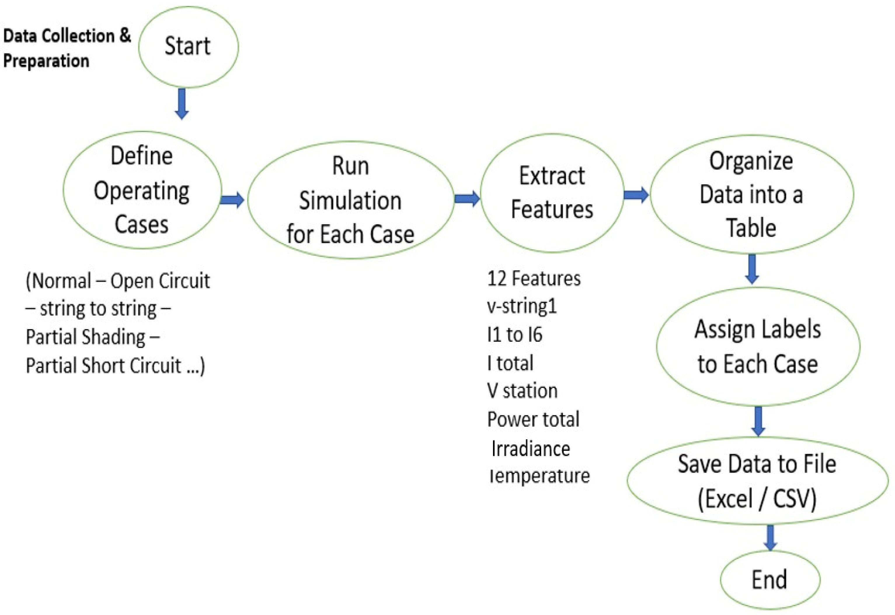 The methodology begins with simulating a 250 kW grid-connected PV system in MATLAB/Simulink, composed of 4 PV strings connected in parallel. Faults were systematically injected into the simulation to reflect five distinct operational scenarios: normal operation, open-circuit fault, partial short-circuit fault, partial shading, and string-to-string fault. Each fault scenario was applied at various string and module locations within the array to ensure diversity and enhance model generalization.