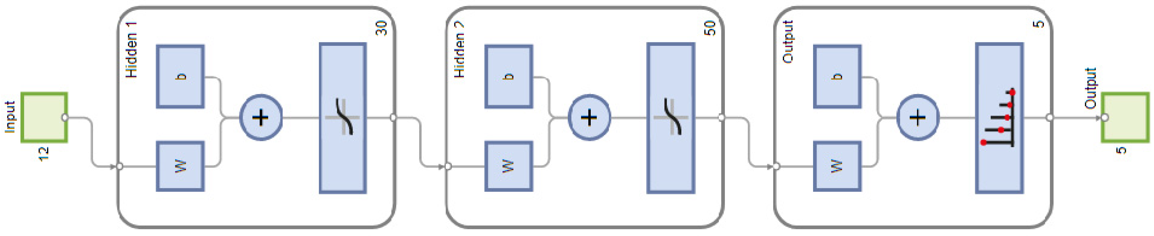 The MLNN consisted of an input layer, two hidden layers, and one output layer. The architecture of the MLNN is illustrated in