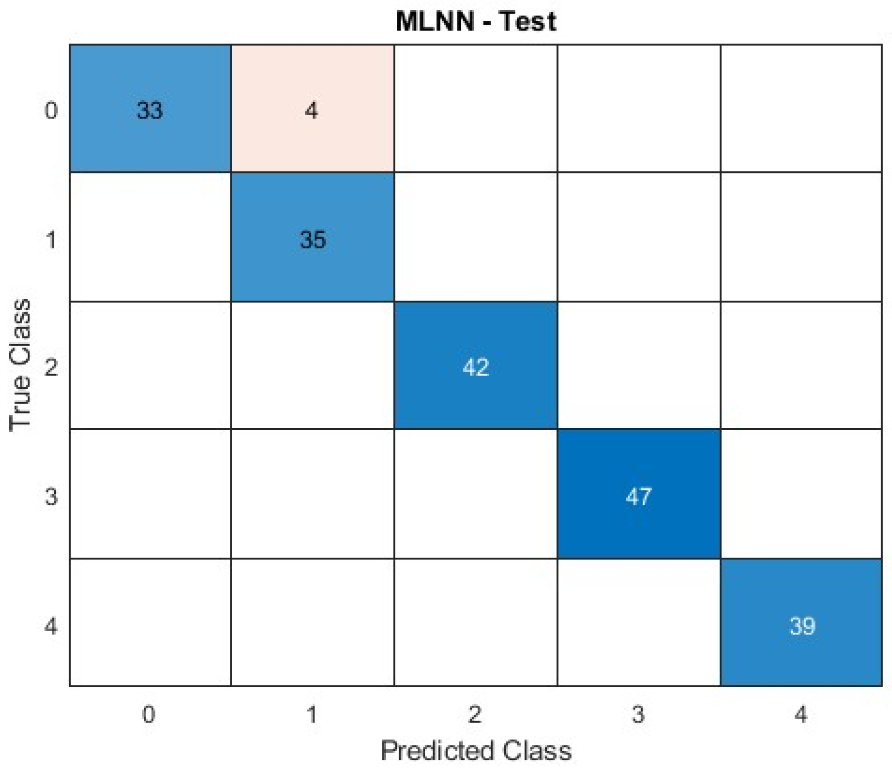 Table 3. The available dataset was divided into 1000 training samples and 200 testing samples, ensuring all five operating conditions were proportionally represented. During MLNN training, MATLAB automatically reserved approximately 15% of the training data for validation, used exclusively for monitoring network generalization and preventing overfitting. No manual data leakage occurred between the training, validation, and testing subsets.