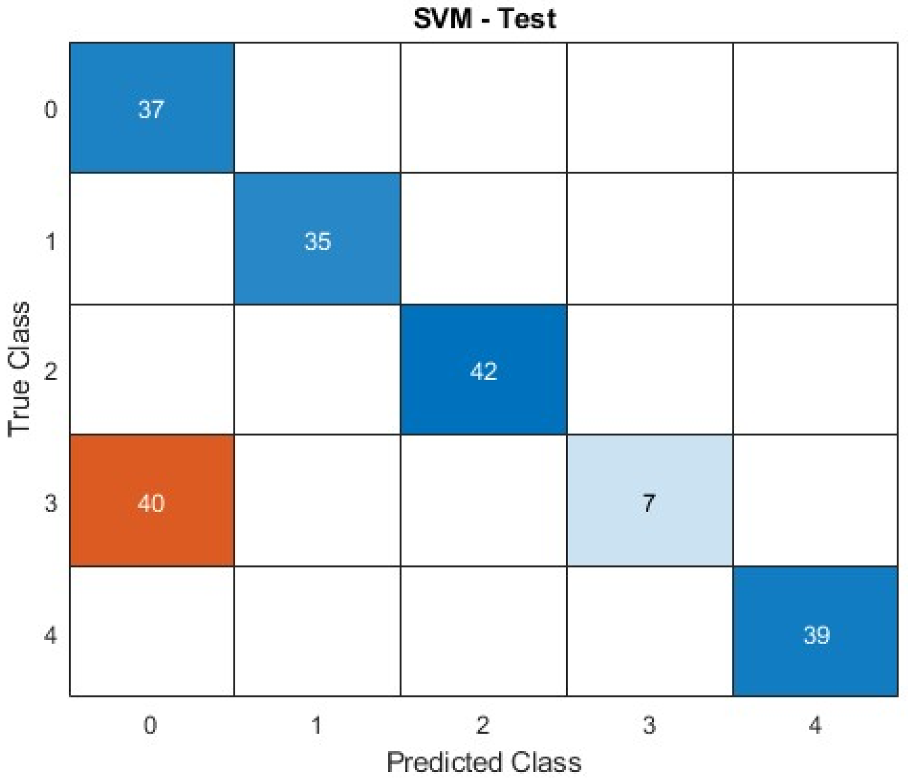 The SVM classifier utilized a linear kernel to separate the fault classes in the feature space. Since the data were already normalized and linearly separable to a reasonable extent, the linear kernel provided a good balance between accuracy and complexity. The structure and training parameters used for the SVM model are summarized in