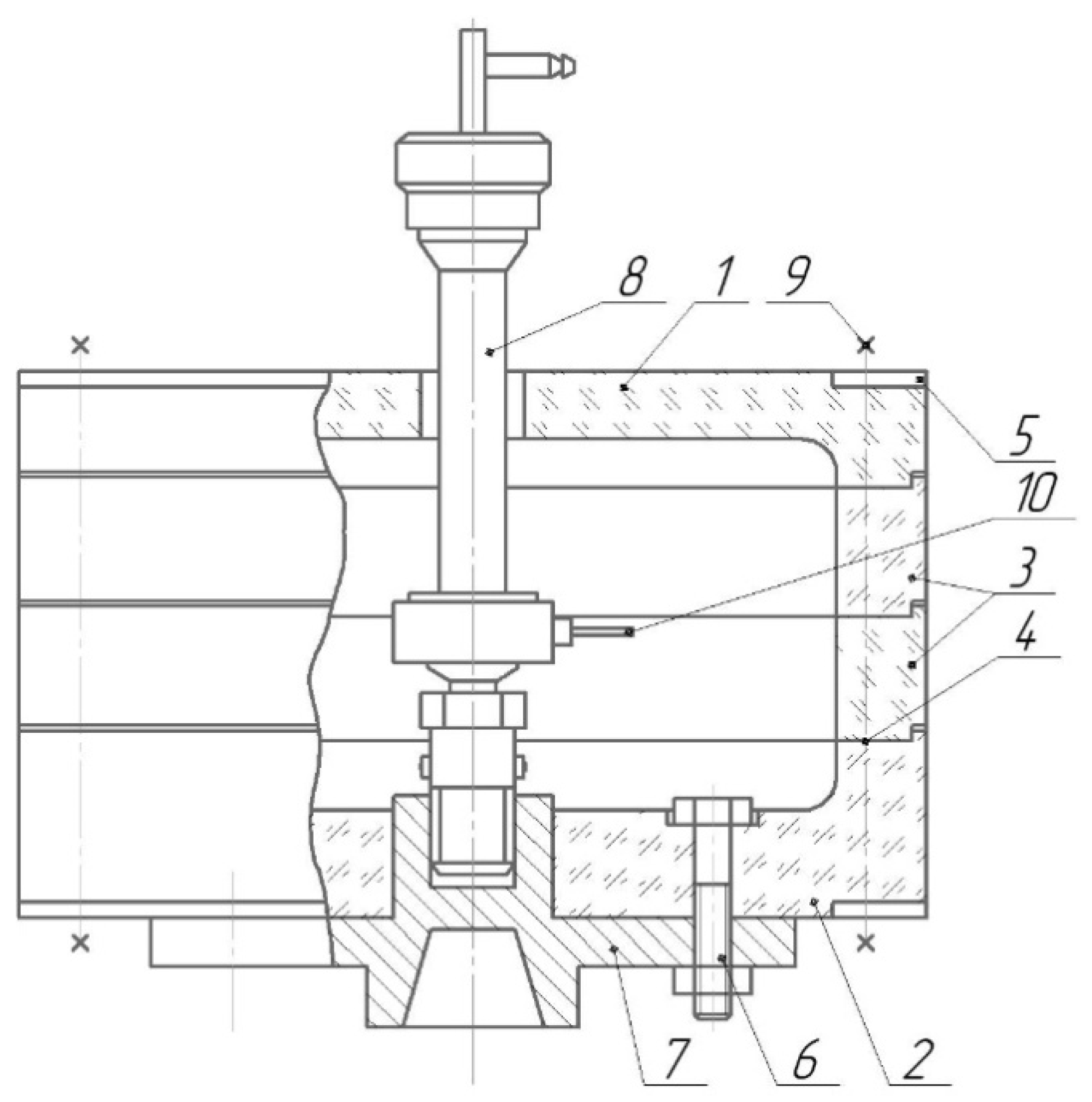 Figure 2) consists of a top cover and a bottom (items 1 and 2) made of transparent plexiglass, as well as a set of interchangeable rings (item 3) with gaskets (item 4) for adjusting the distance between the cover and the bottom depending on the requirements of the experiment. To ensure strength, metal rings (item 5) are installed on the lid and bottom, and the entire set of elements is fastened with pins (item 9) located around the periphery of the vessel. The bottom is connected by bolts (item 6) to a crosspiece (item 7), which has a conical hole at the bottom for attaching the vessel to the shaft of the installation, and at the top, in the center of the crosspiece, there is a mounting seat for the droplet-forming device (item 8). The latter is designed to ensure uniform separation of droplets from the nozzles (item 10) as a result of shaking. To ensure the tightness of the dispersing device, fluoroplastic bushings are inserted into the center of the body, allowing the feeder needle to rotate freely and, at the same time, retain the dispersed phase. A set of nozzles of various lengths and diameters allows droplets of widely varying sizes to be obtained. Inside the vessel, in the plane of the nozzles, there is a scale ruler used to calibrate images and determine the magnification scale when processing photographic materials, as well as for correct centering of images.