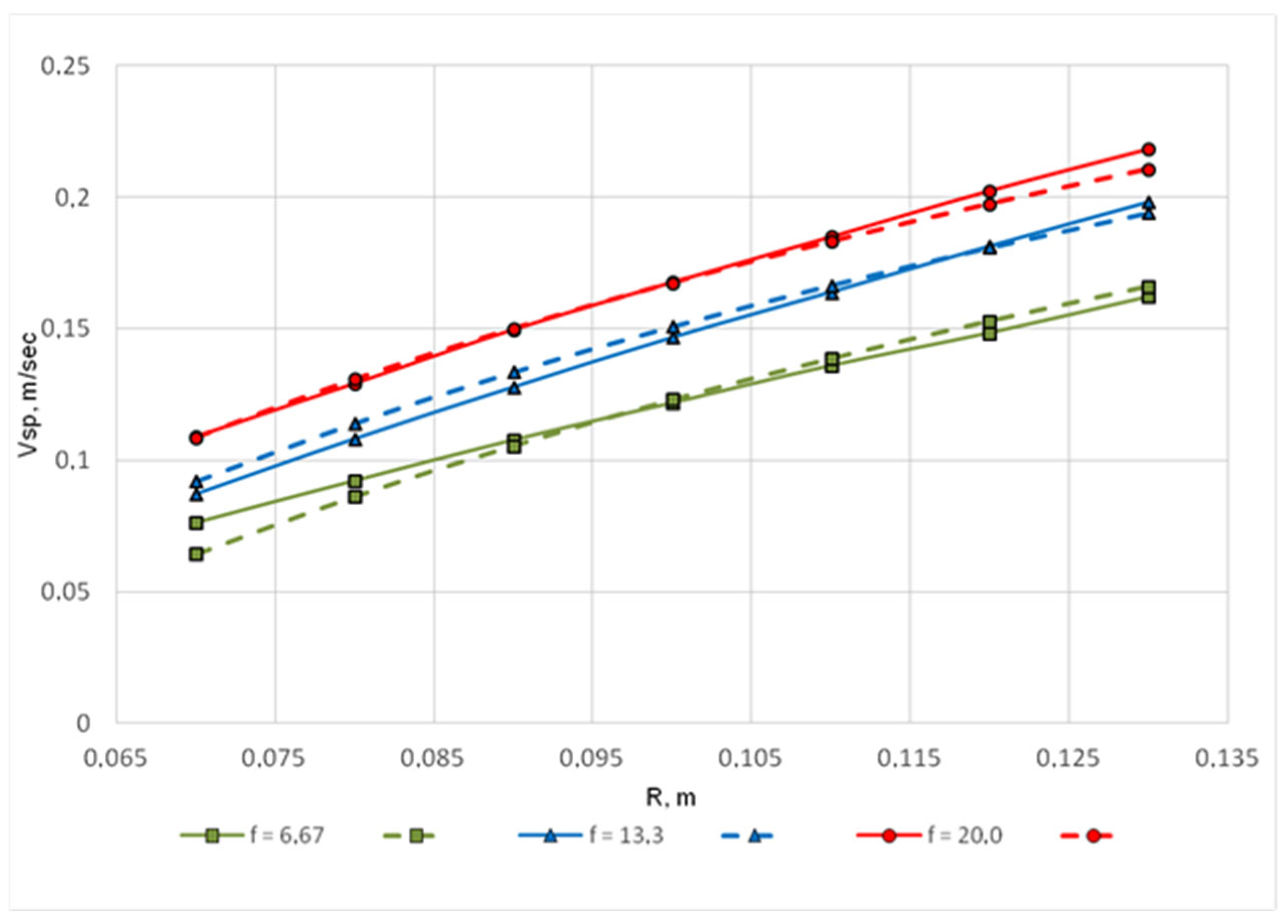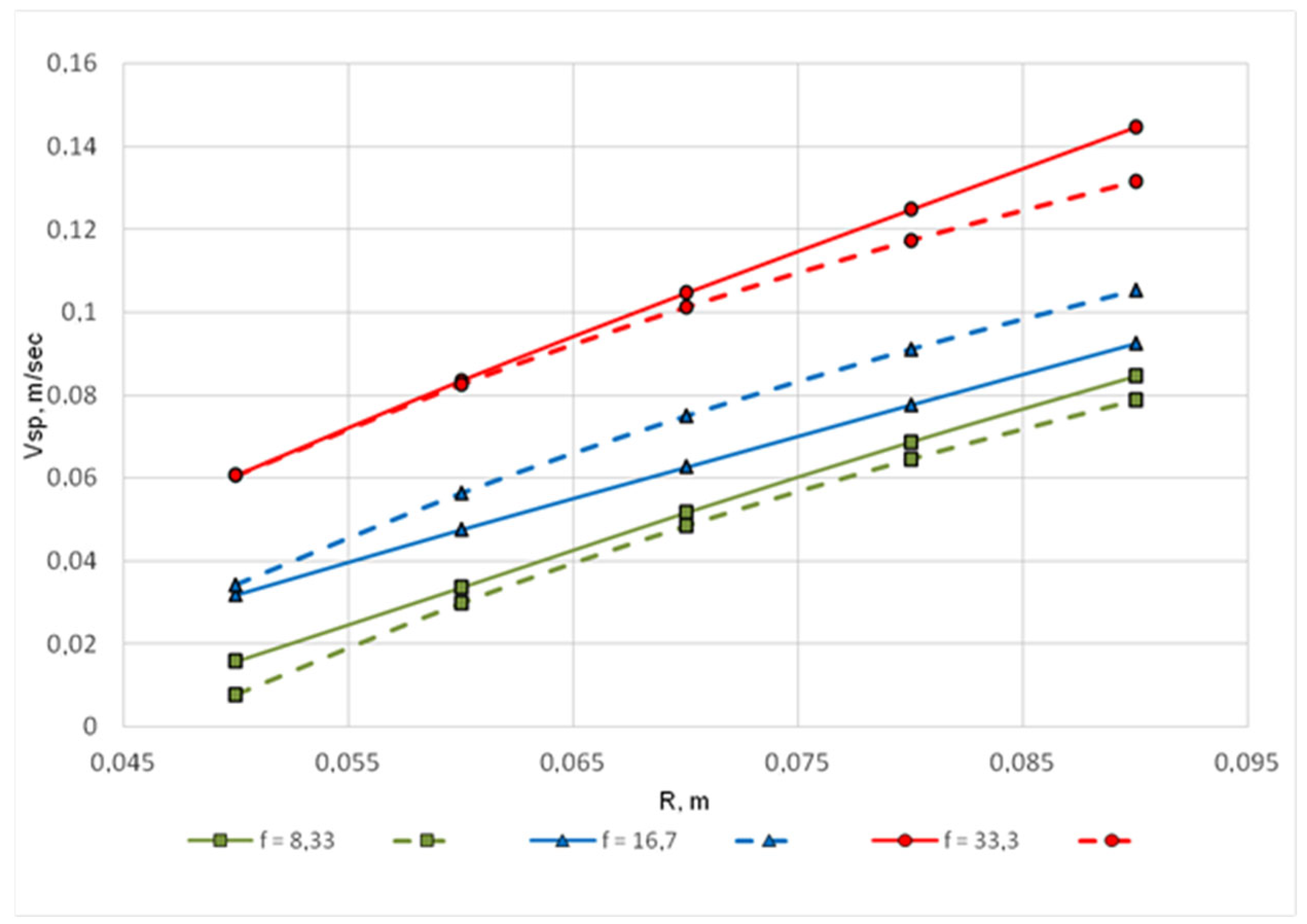 Thus, it becomes possible to determine the general functional dependence of velocity on radius and frequency, which is valid for the range of values studied in this experiment. Applying mathematical processing methods to the experimental data allows us to determine a generalized dependence for the three systems studied: .