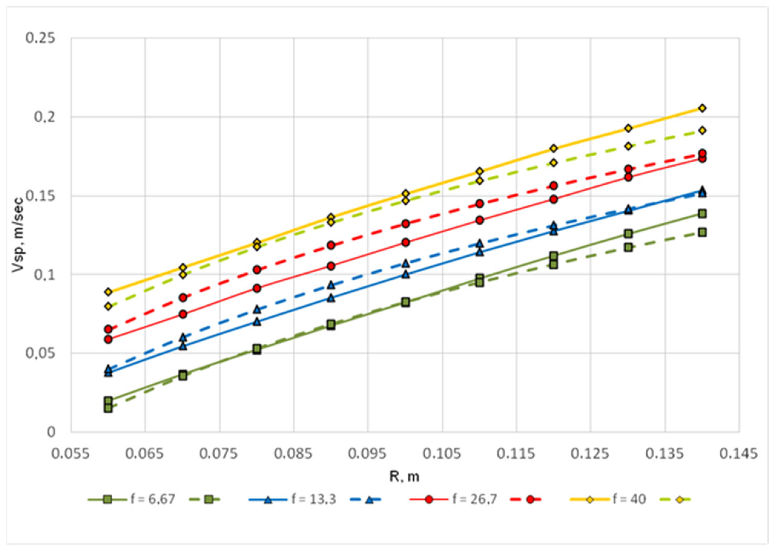 Figure 6) shows the calculated values according to the specified equations, depending on the velocity of the accompanying flow from the radial distance to the axis of rotation (R) and the frequency of droplet supply from the feeder (f) for the corresponding systems under study: