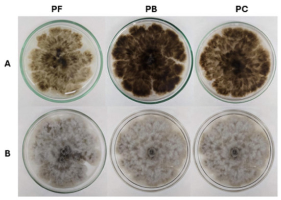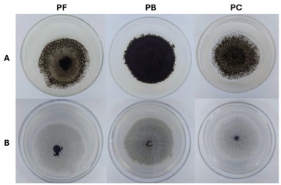Endophytic fungus C. mamane CCM-UEA-F0869 after 7 days of growth on potato dextrose agar (PDA), derived from fungi preserved using filter paper discs in sterile mineral oil (PF), slanted PDA covered with sterile mineral oil (PB), and Castellani’s method (PC). (A) Colony obverse; (B) Colony reverse.