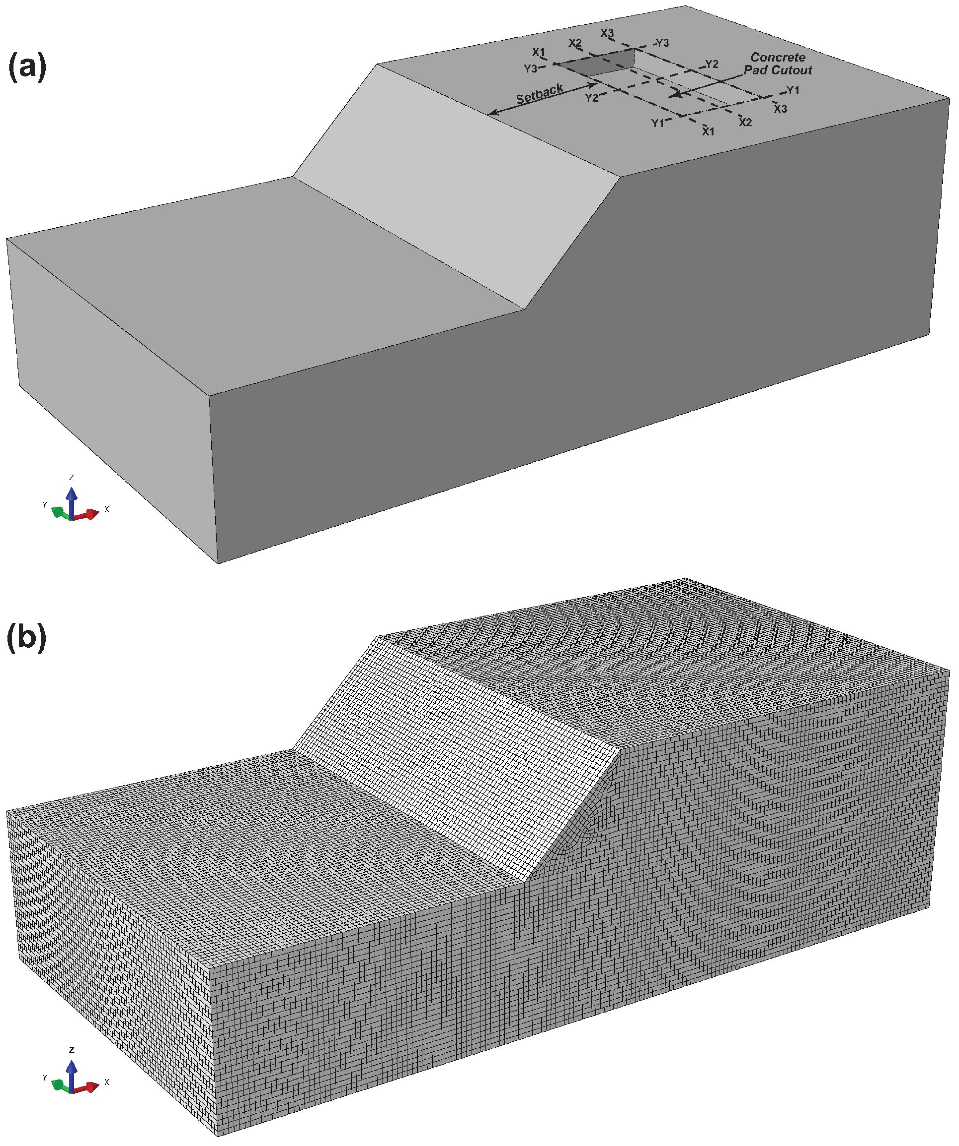 Model for foundation atop a slope, showing (a) model geometry and (b) volume discretization (finite difference mesh). The model geometry shows a cutout representing the concrete pad, the definition of foundation setback, and six section lines across the concrete pad. The mesh consists of brick-shaped elements with length dimensions of 0.5 m everywhere, except near the slope where the element dimensions vary to follow the slope geometry. The model domain extends an additional 10 m (with the same mesh) below the figure plot.