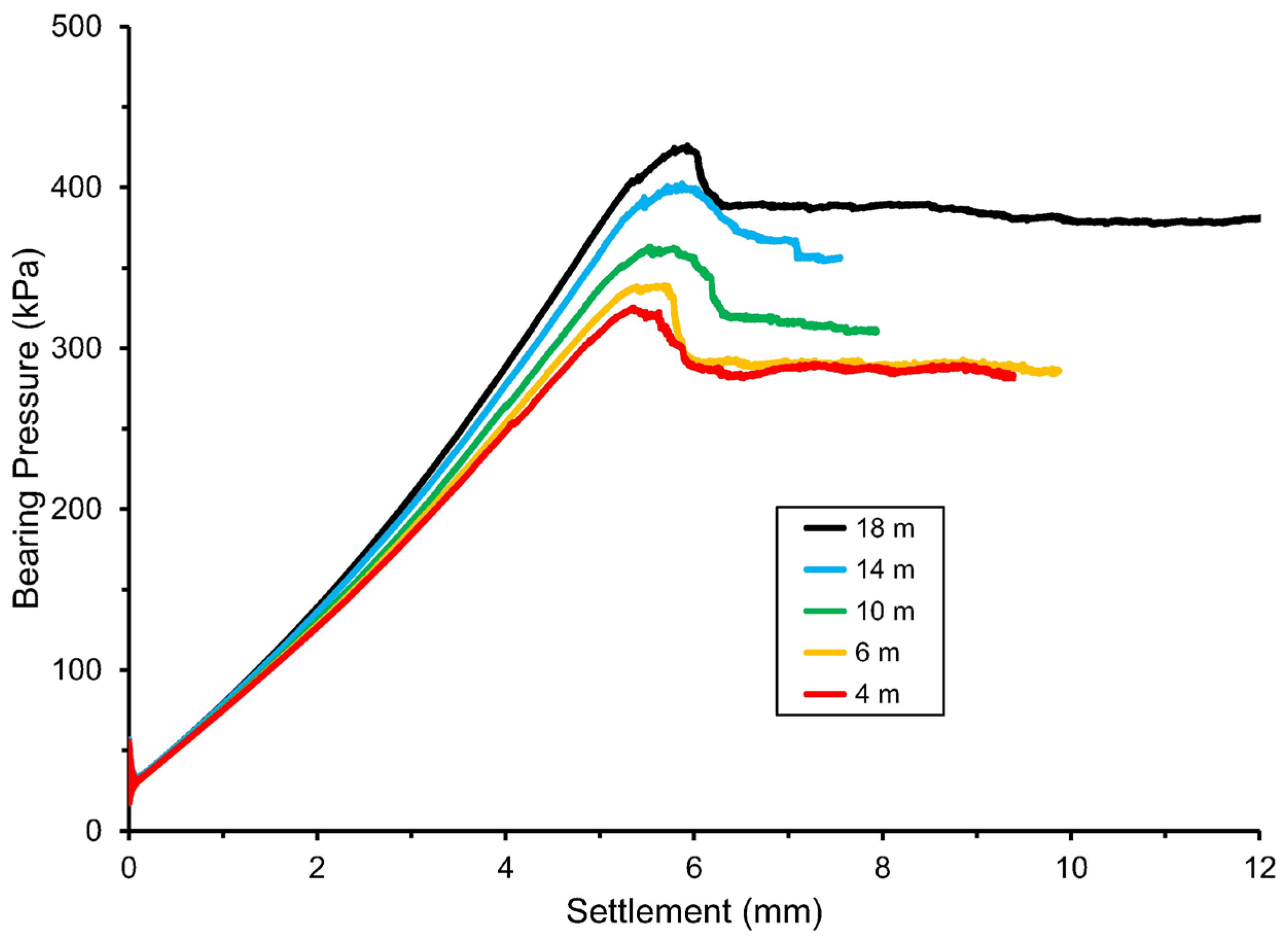 Following the traditional approach for foundation analysis, the bearing capacity can be determined by applying a safety factor to the ultimate bearing pressure (top two curves of