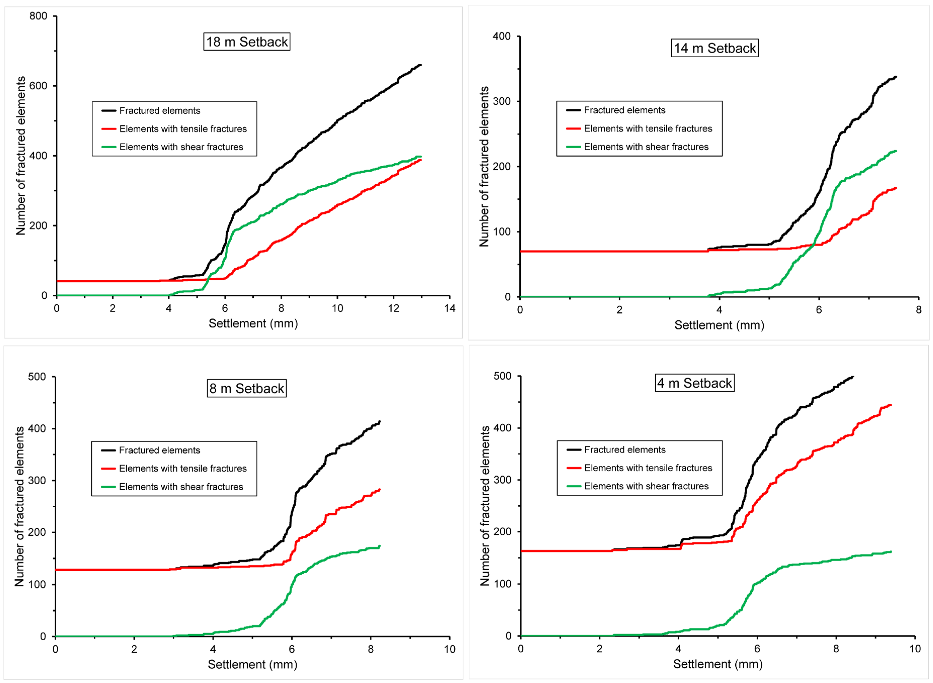 3 per element) versus settlement, from soil model with tensile strength of 10 kPa for foundation models with a setback of 18, 14, and 8, and tensile fractures that occurred in the transition zone (