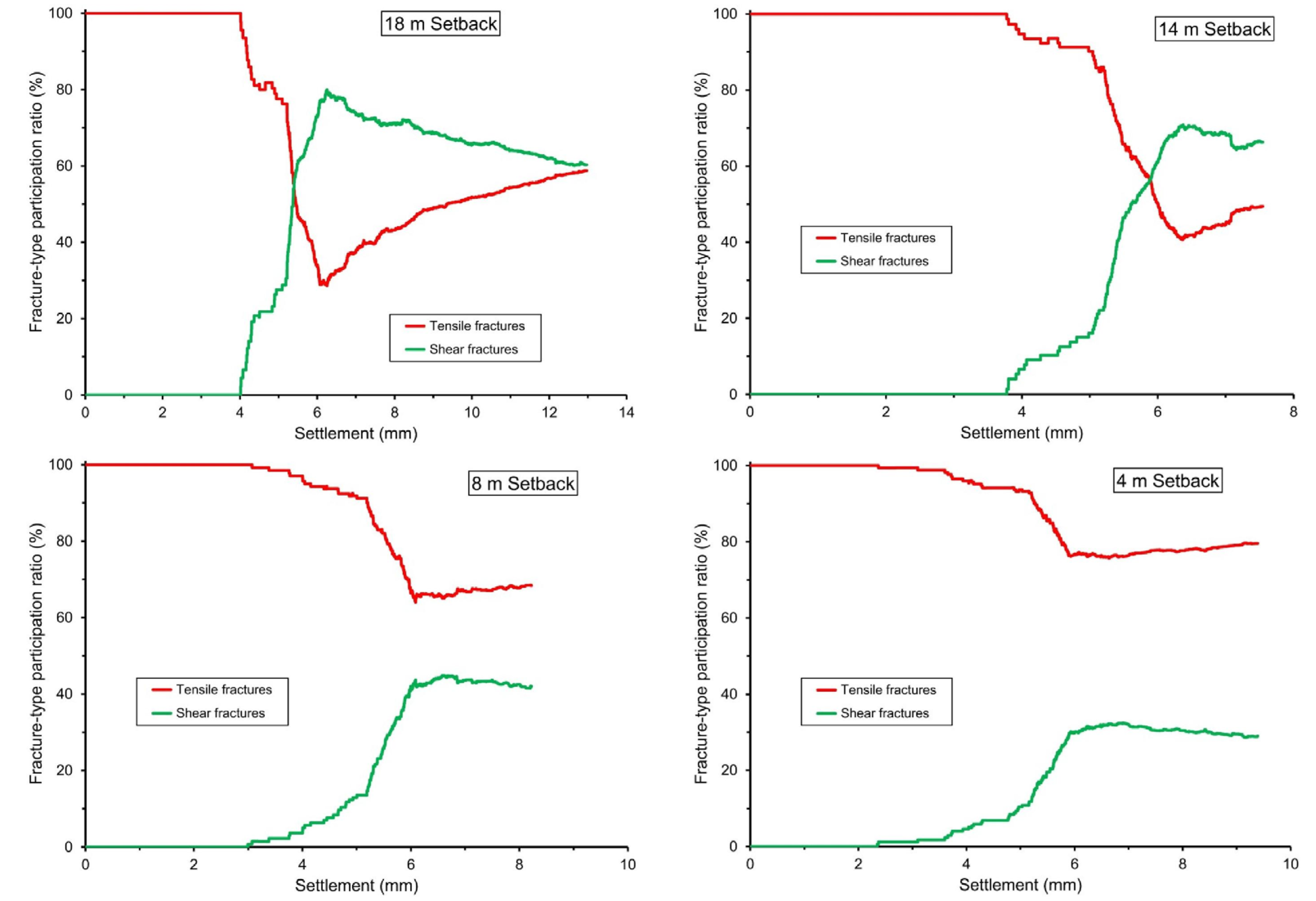 Fracture type participation ratio versus settlement, from soil model with tensile strength of 10 kPa for foundation models with a setback of 18, 14, 8, and 4 m from the slope crest.