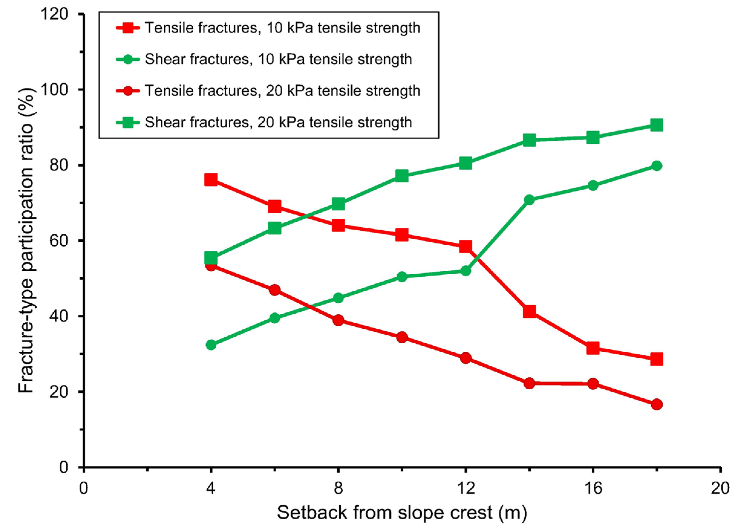 Fracture type participation ratio, showing the effects of foundation setback and soil tensile strength, based on the foundation-atop-slope model calculations.