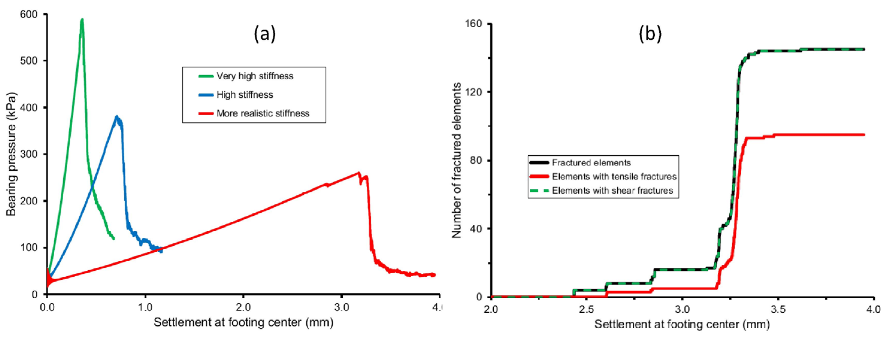 Results from the verification analysis of a shallow foundation on homogenous soil under a level ground surface: (a) bearing pressure versus settlement for three soil stiffness models and (b) fractures versus settlement for the “more realistic stiffness” model.