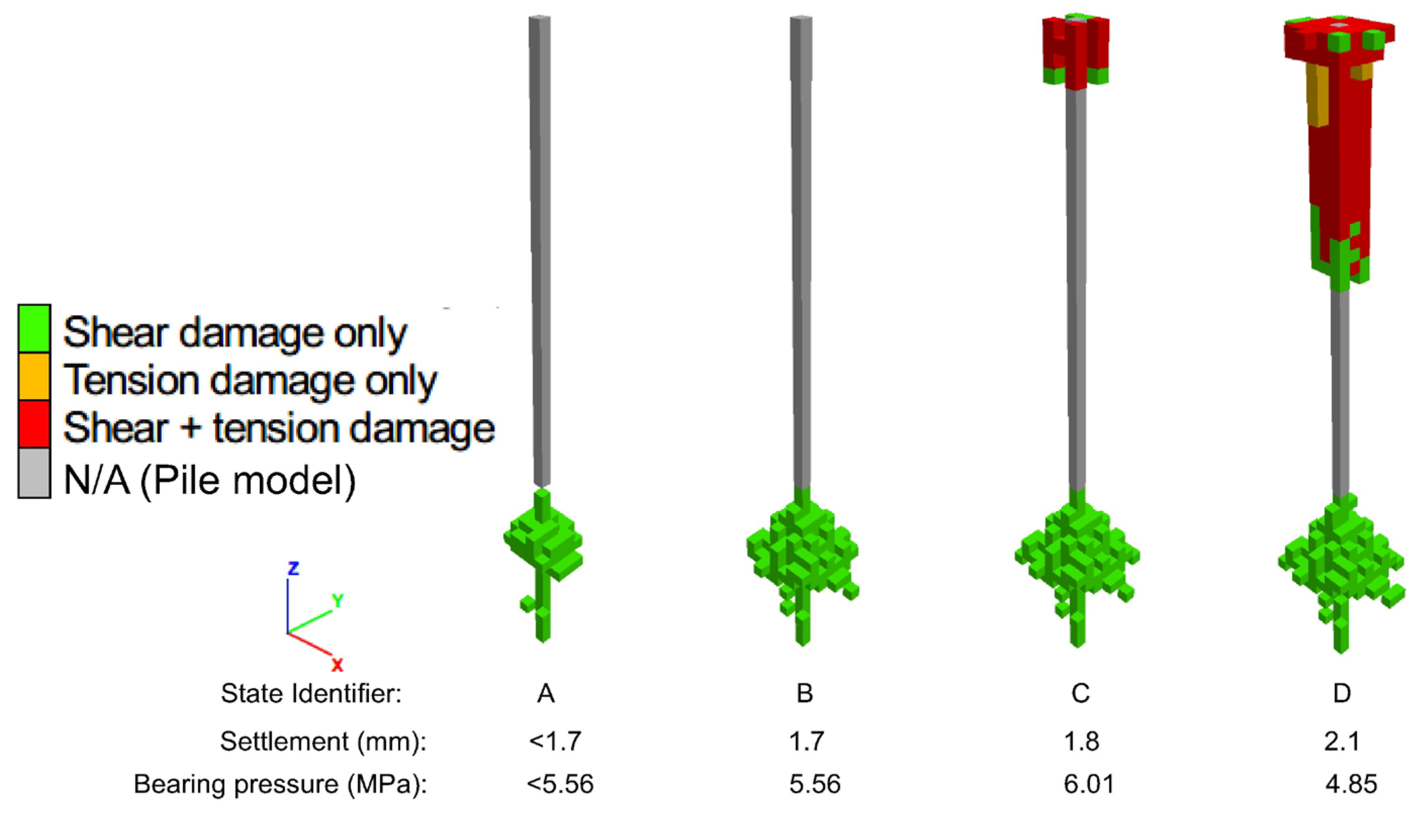 Figure 4) by using the mechanical damage behavior to determine bearing capacity without using the ultimate bearing pressure. This “damage-based bearing capacity” is determined using a characterization of soil mechanical damage that FBCM provides in terms of the number of fractured domain elements, which is proportional to the volume of fractured soil because the element volume is essentially constant (