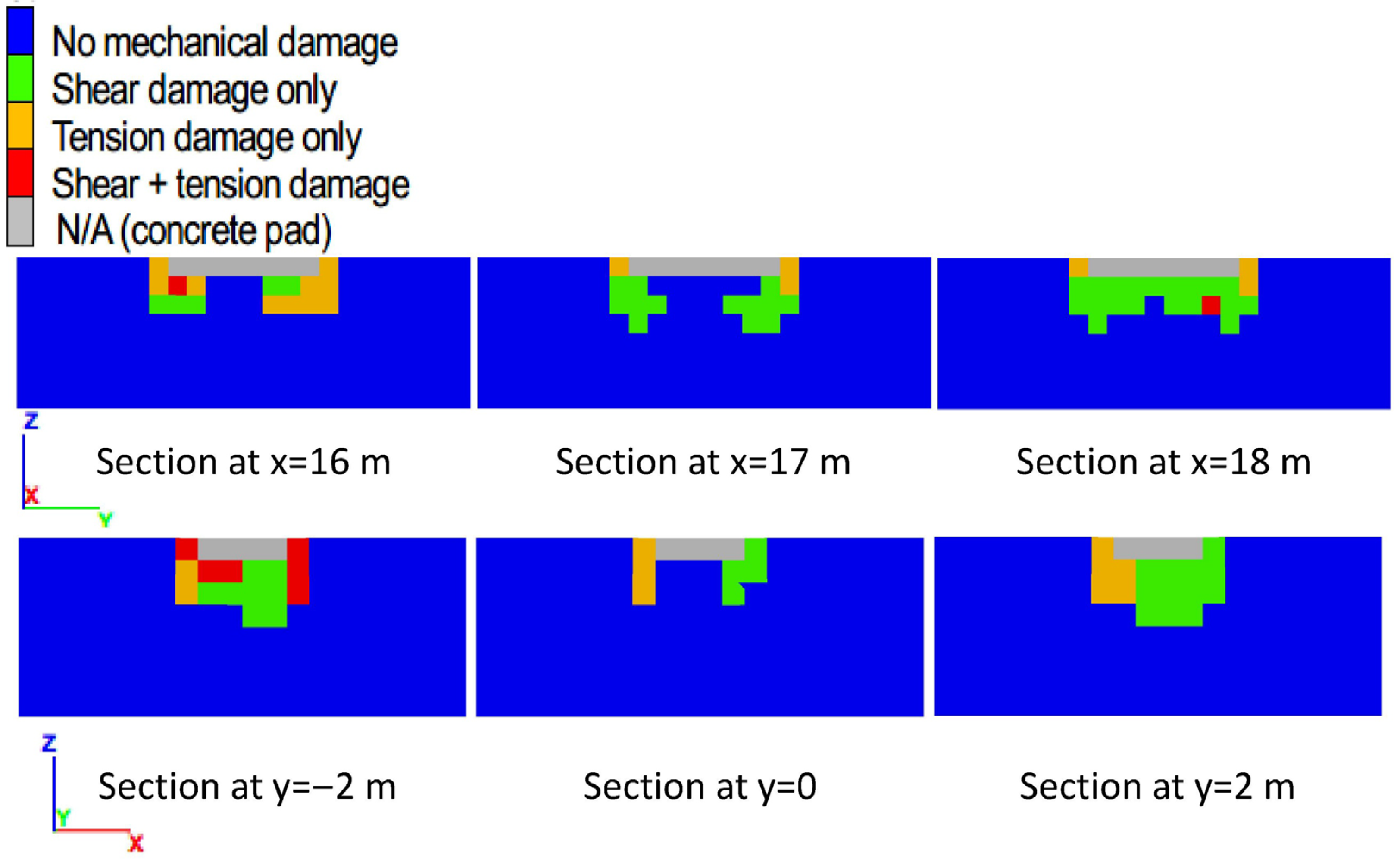 Two perpendicular sections through the concrete pad, showing the spatial distribution of damage at the state of peak bearing pressure, for the model with a foundation setback of 18 m and soil tensile strength of 10 kPa.