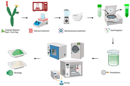A frequently utilized pretreatment method involves the thermal processing of the internal tissue (medulla) of cladodes by boiling them in water. This process serves to soften the plant matrix, thereby enhancing the release of mucilage. Such thermal pretreatment has been accomplished through conventional heating [27] or microwave-assisted techniques [36]. Thermal pretreatment softens cell wall matrices and enhances polysaccharide release by promoting pectin solubilization and water diffusion [28]. However, prolonged exposure to heat may induce partial depolymerization of galacturonic acid chains, leading to reduced viscosity and alterations in the molecular weight distribution of the extracted mucilage [20]. Consequently, the use of thermal pretreatment represents a trade-off between enhanced yield and the potential loss of rheological and structural integrity. Numerous studies have therefore omitted the heating step, opting instead for mechanical methodologies, including pressing, blending, milling, or maceration of the peeled and diced cladodes to generate a viscous gel [15,19,26]. Notably, in studies where thermal pretreatment was implemented, mechanical disintegration frequently followed as a supplementary procedure [28,32].