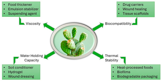 Opuntia ficus-indica (OFI) has also had a long history of culinary and medicinal use. The cladodes are consumed as vegetables or processed into flour, while the fruits are used in juices, jams, and syrups [9]. Its high moisture content also makes it a valuable source of livestock feed, often requiring minimal processing [10]. Ethnobotanical evidence highlights its use in traditional medicine, particularly in regions such as Mexico, where various plant parts are employed in managing burns, diabetes, edema, asthma, and hypertension [11]. Similar uses have been reported globally, for instance, the fruit is used in kidney stone and diabetes management in Turkey, and different parts of the plant are applied in ulcer and gastrointestinal treatment in China [12,13]. These diverse agronomic and ethnobotanical attributes highlight OFI as a resilient and multifunctional crop and also provide a compelling rationale for the increasing scientific interest in its mucilage.