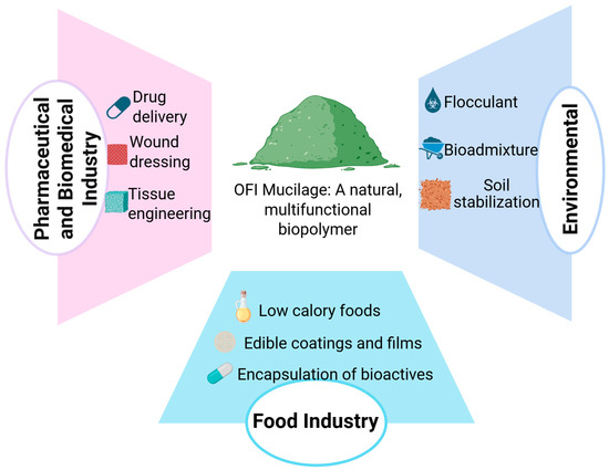 In response to these challenges and opportunities, this review provides a comprehensive synthesis of current research on OFI mucilage. It explores the sources, extraction techniques, physicochemical characteristics, and current and emerging applications of OFI mucilage across multiple industries. The review also critically examines its advantages over conventional and plant-based polymers, identifies key technological and regulatory bottlenecks, and outlines strategic directions for future research and industrial integration. By bridging insights from plant sciences, materials engineering, environmental sustainability, and bioeconomics, this work aims to inform the development of OFI mucilage as a commercially viable, high-performance biopolymer for a greener future.
