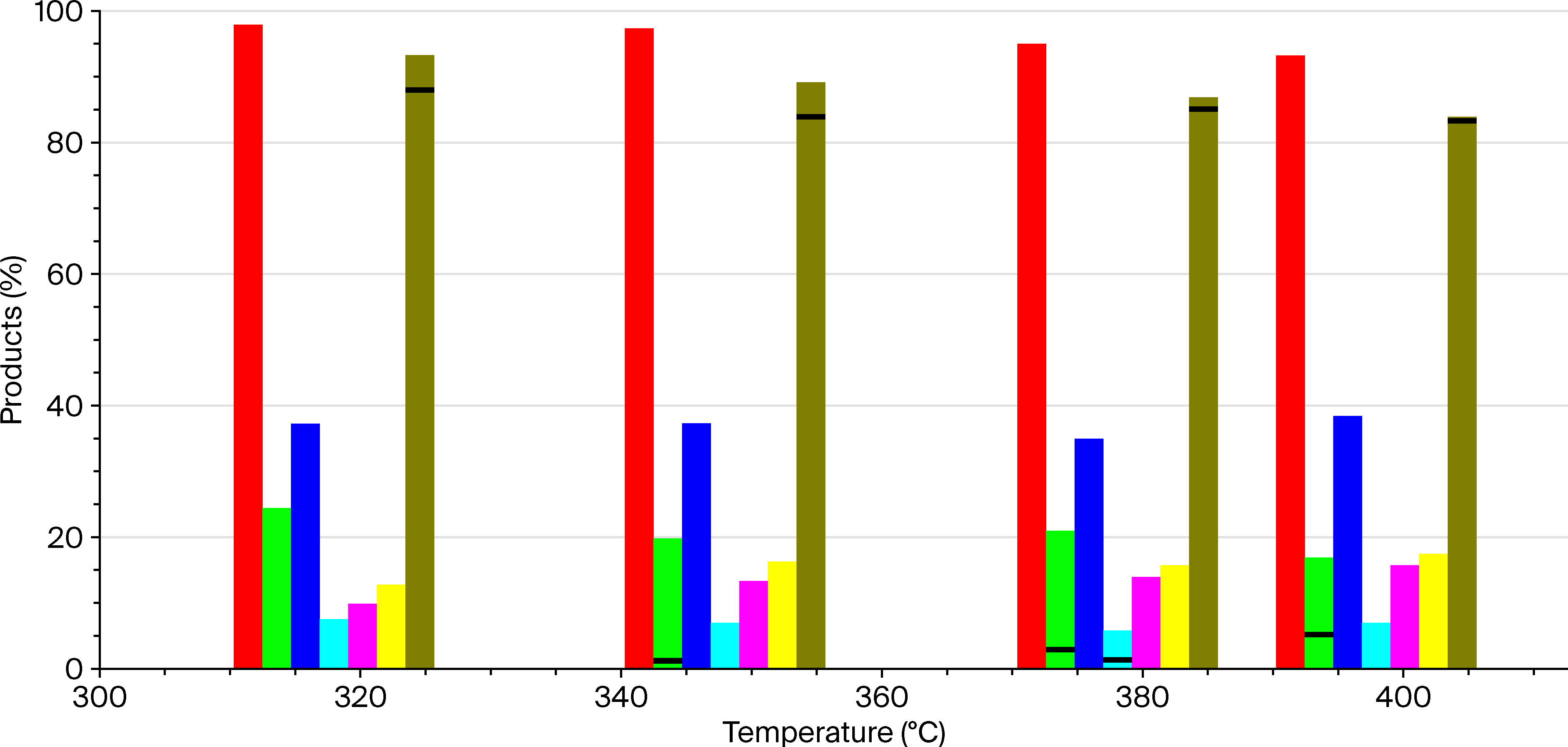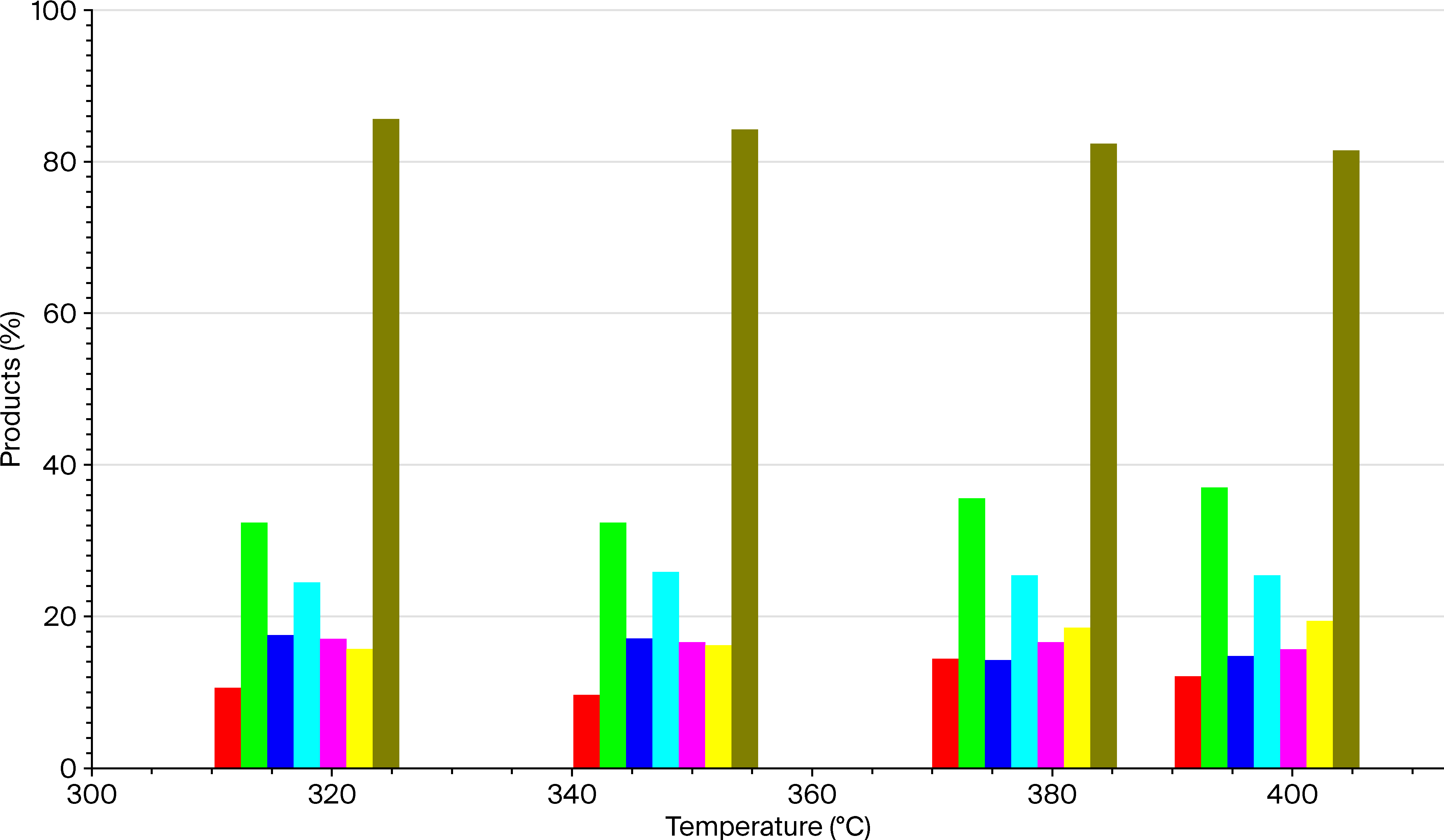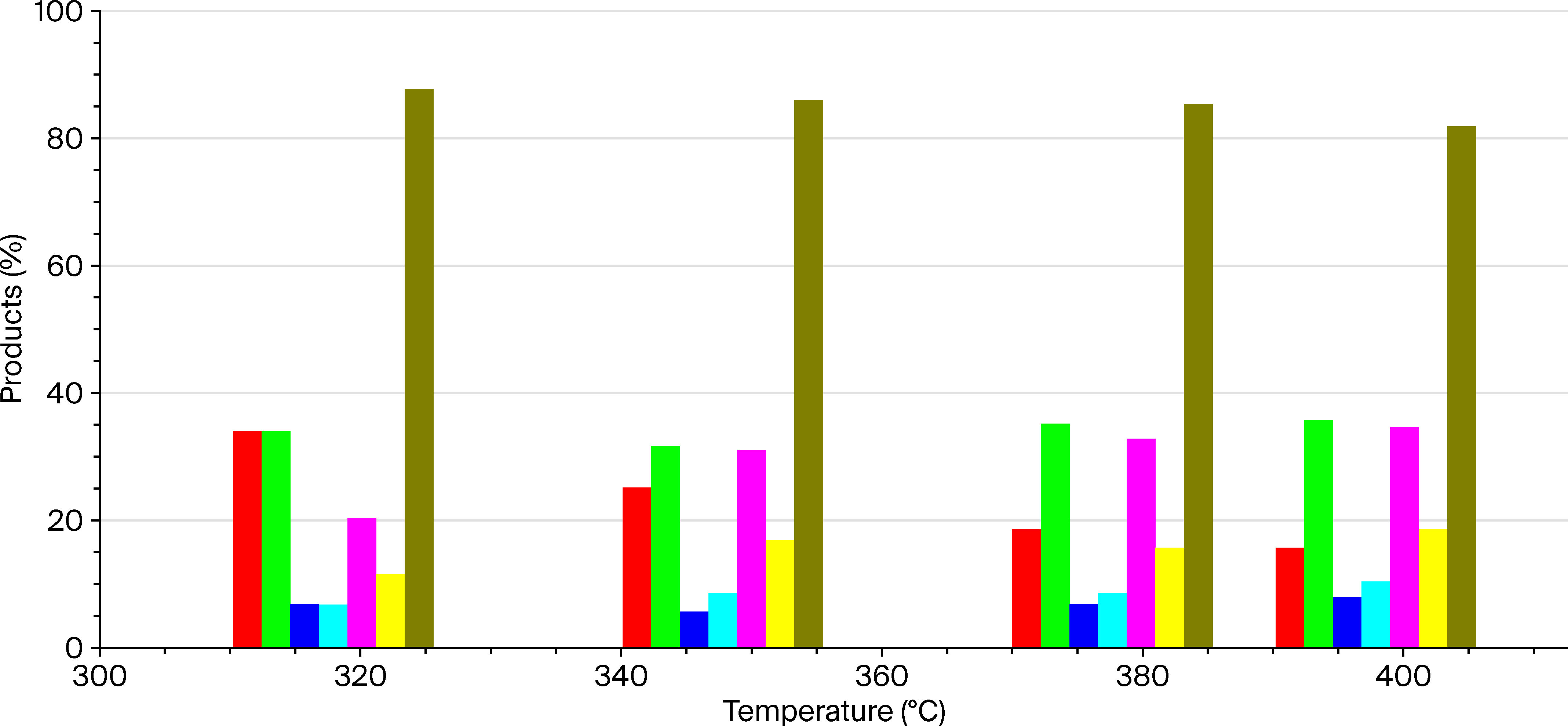 | Products (%) | Temperature (°C) | ||||
