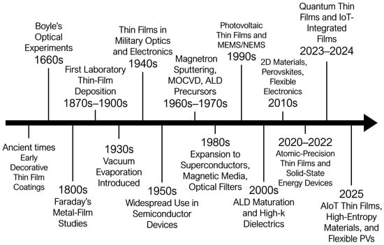 The evolutionary trajectory of thin film technology—from its early use in decorative coatings to its present role in advanced electronic, optoelectronic, and energy devices—is summarized in Figure 1. The timeline traces pivotal milestones, including the introduction of vacuum deposition in the 1930s, the development of chemical vapor deposition (CVD) and magnetron sputtering in the mid-20th century, and the subsequent expansion into semiconductor, photovoltaic, and flexible electronic applications. This progression underscores how thin films have transitioned from simple protective layers to essential functional materials in modern technology.